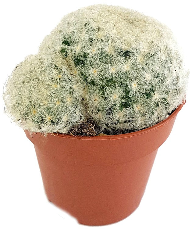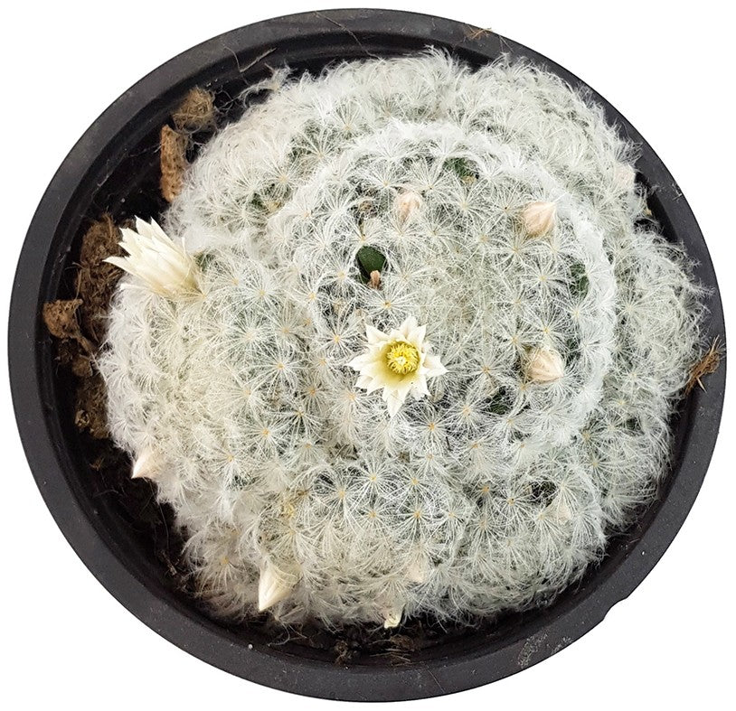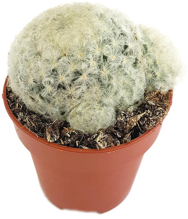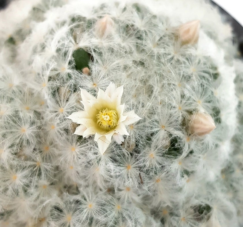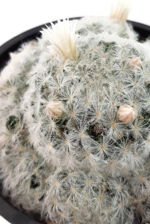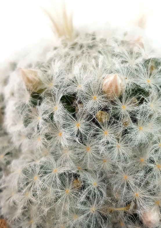 Mammillaria plumosa verblüfft mit ihren sanften, federartigen "Stacheln". In seiner Heimat in Mexiko wächst dieser exotische Kaktus auf Kalksteinfelsen und bildet niedrige Polster aus, welche ca. 40 cm Durchmesser erreichen.