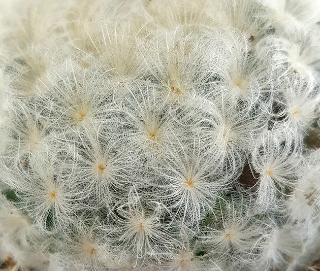 Die kleinen hügeligen Gruppen dieses imposanten Kaktus sind komplett mit den dichten gefiederten Stacheln bedeckt.