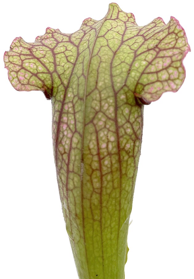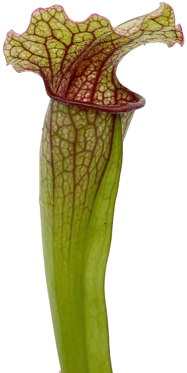 Sarracenia X "Fiona" ist eine sehr ansprechende Leucophyllahybride zu jeder Jahreszeit. Der aufrechte Deckel und die breite Trichteröffnung der Pflanze weisen ebenso auf einen Purpureaanteil hin. Die Fangblätter erreichen eine Höhe von ca. 40 cm.