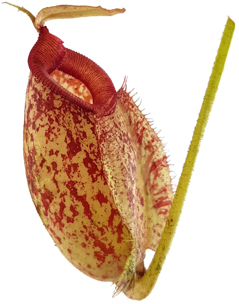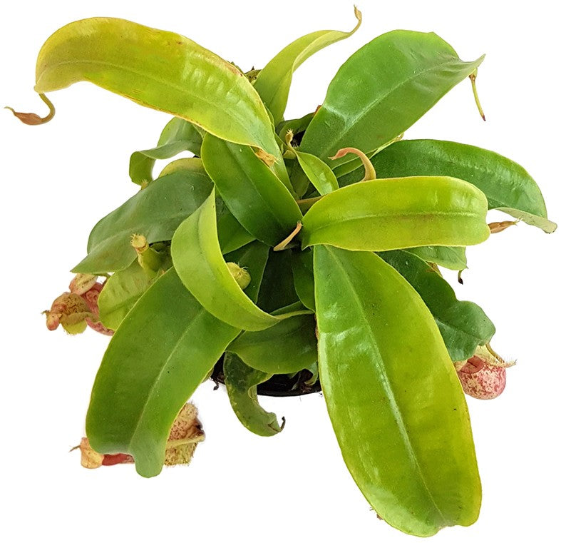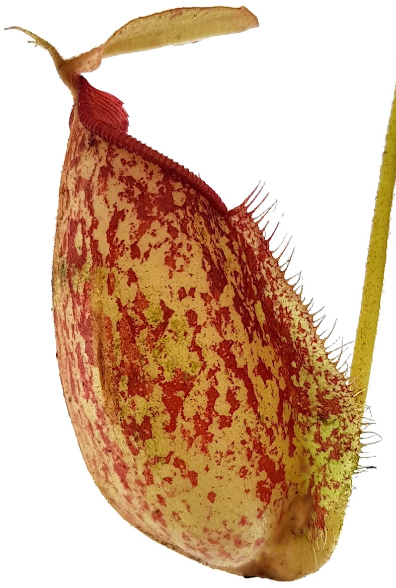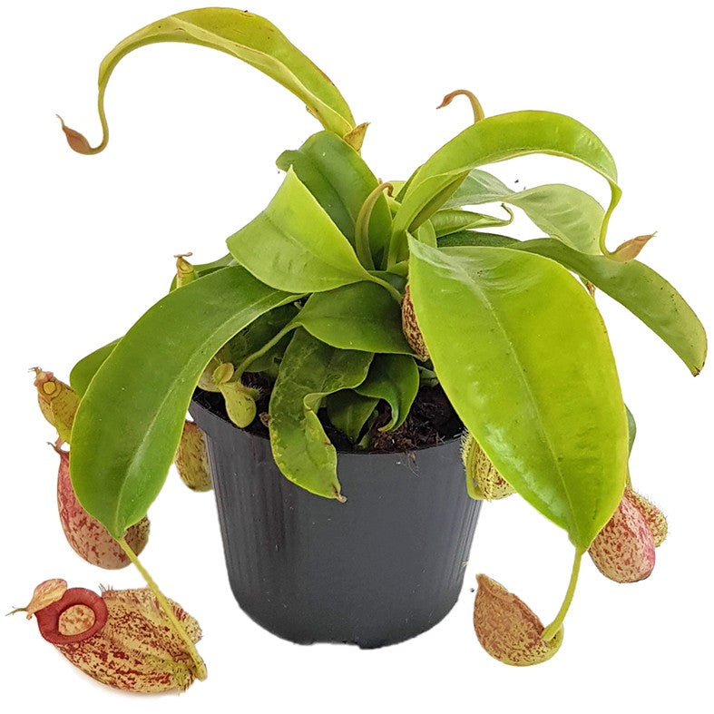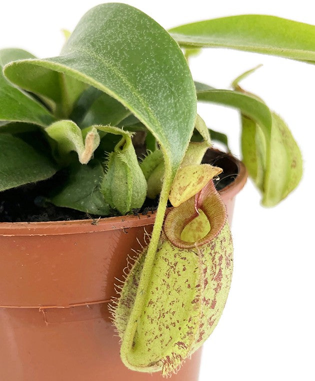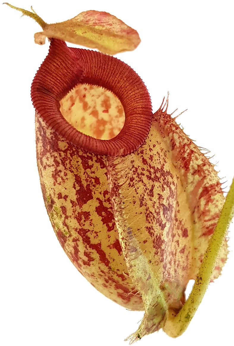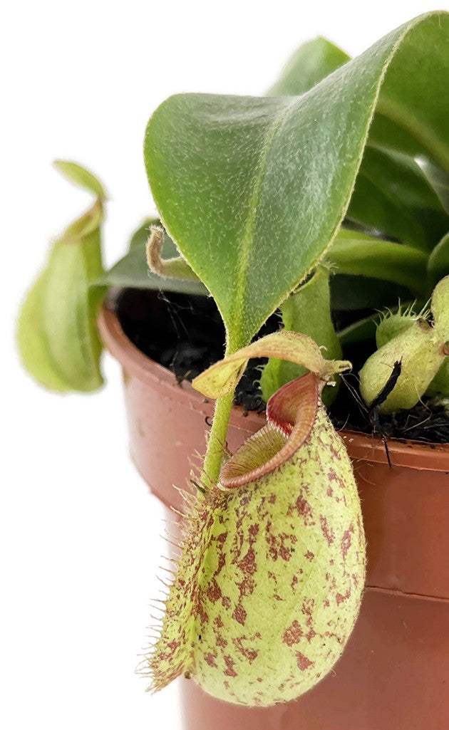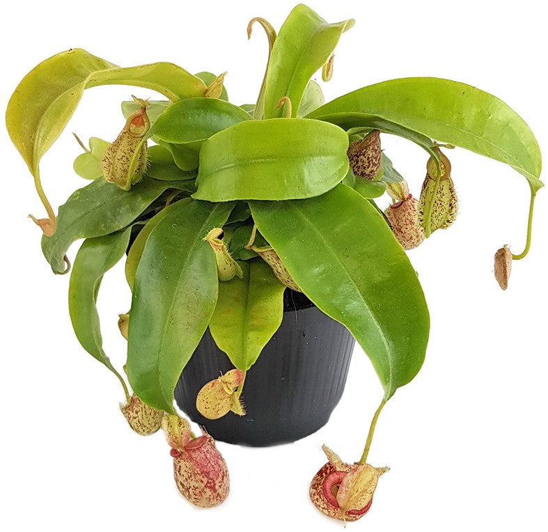 Die Nepenthes X "Hookeriana" ist eine faszinierende Hybride aus Nepenthes ampullaria und Nepenthes rafflesiana. Diese exklusive Kannenpflanze beeindruckt mit ihren bauchigen, großen Kannen, die von charakteristischen roten Sprenkeln verziert sind, welche im Herbst und Winter zunehmend intensiver werden.