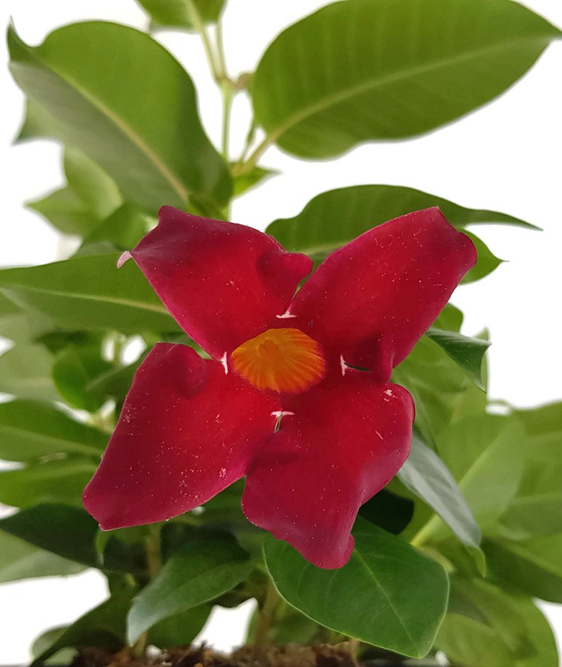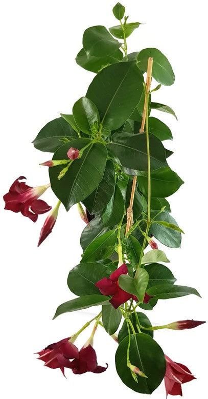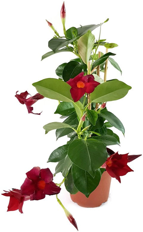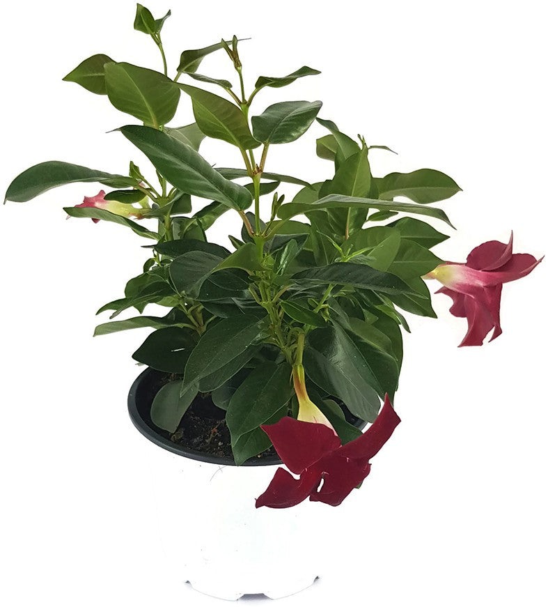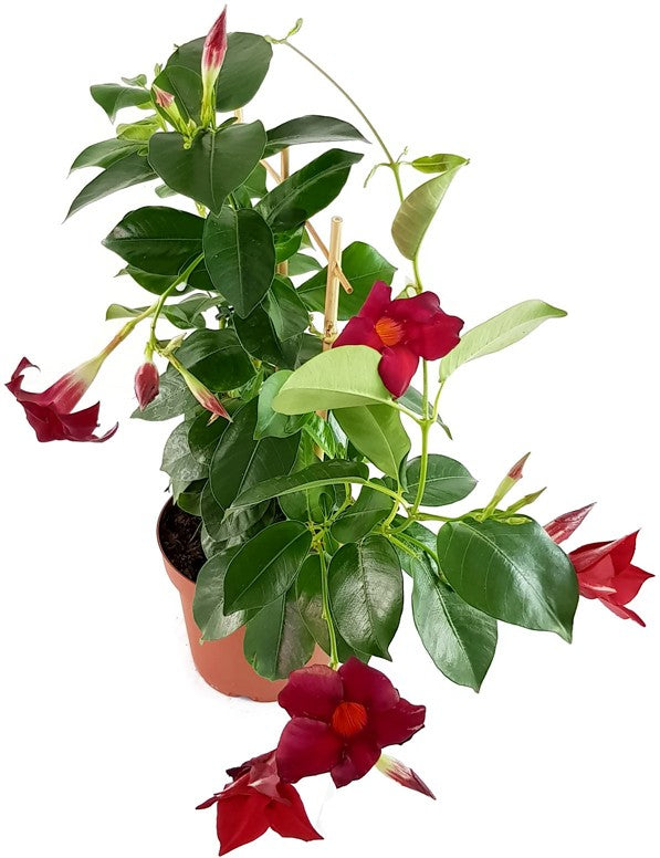Dipladenia ist eine außergewöhnliche Kletterpflanze und bezaubert mit ihren dunkelroten Blüten und ihren glänzenden Blättern. Im Sommer lässt die Dipladenia ihren Standort in einem wahren Blütenmeer versinken.