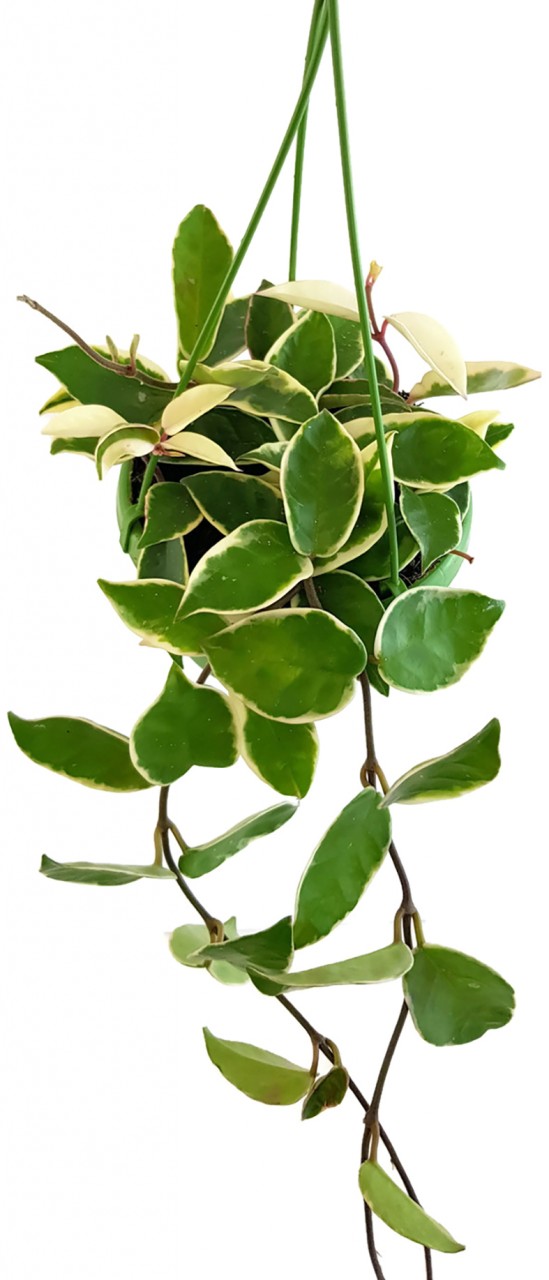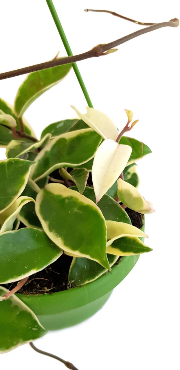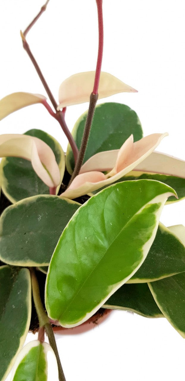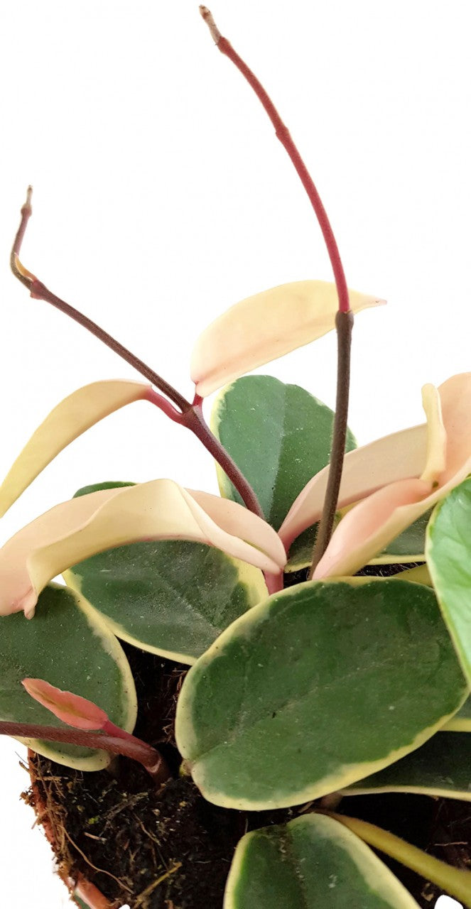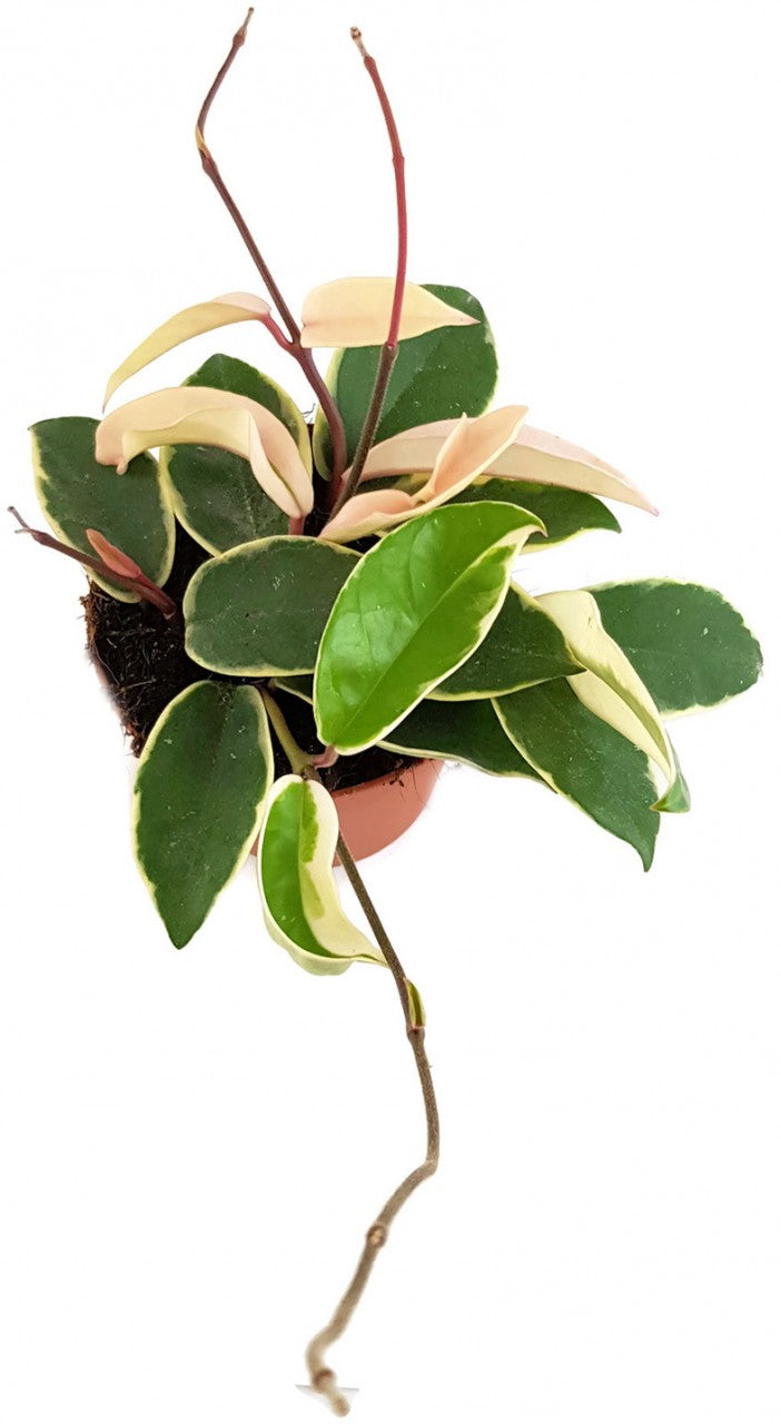 Die Hoya carnosa "Krimson Queen" ist eine besondere Zimmerpflanze, welche im Sommer an langen Ranken Blütendolden ausbildet. Die vielen Blüten der Dolde erinnern an zartes Porzellan, daher stammt ihr Zweitname Porzellanblume. Außergewöhnlich an dieser Hoya ist ihr wundervoll grün, weiß panaschiertes Laub.