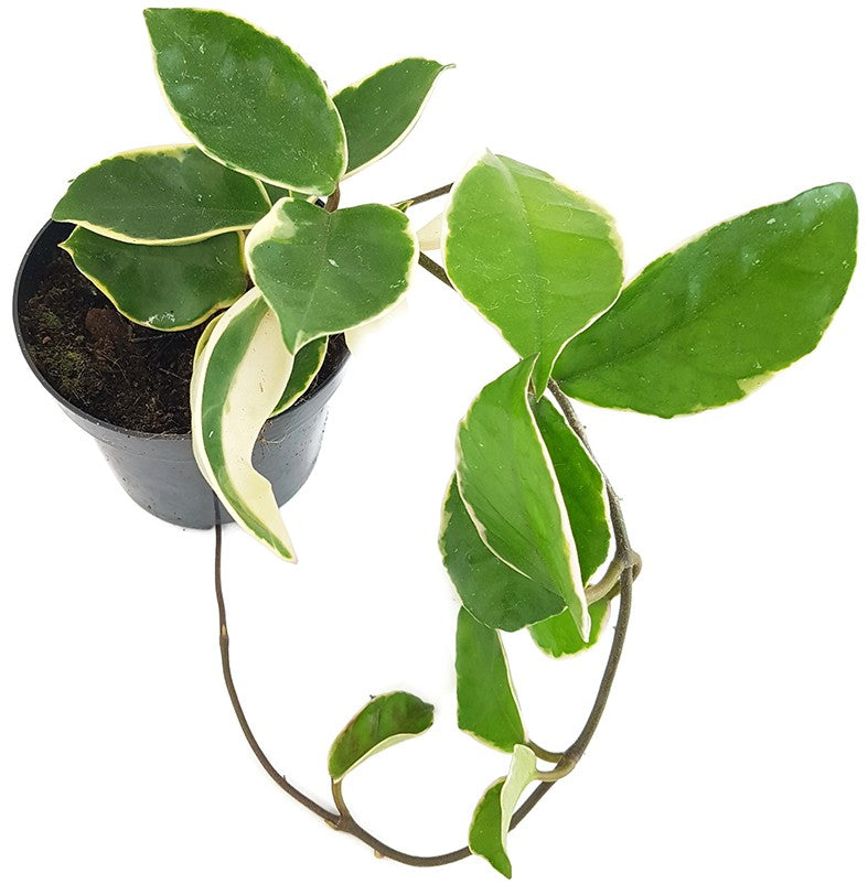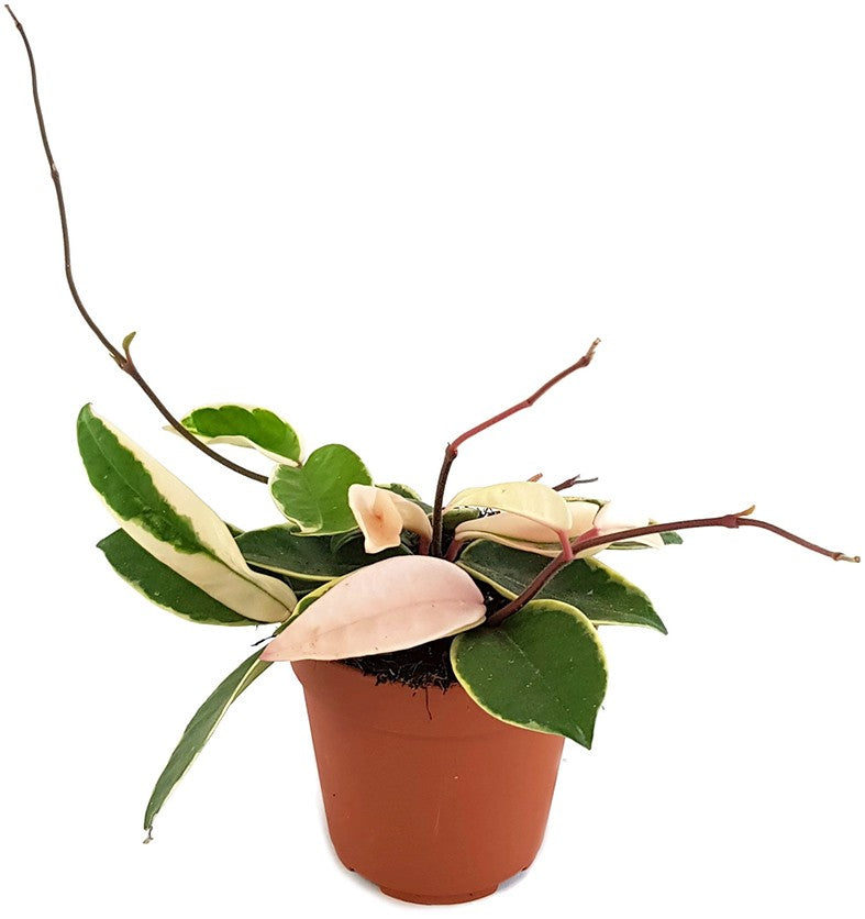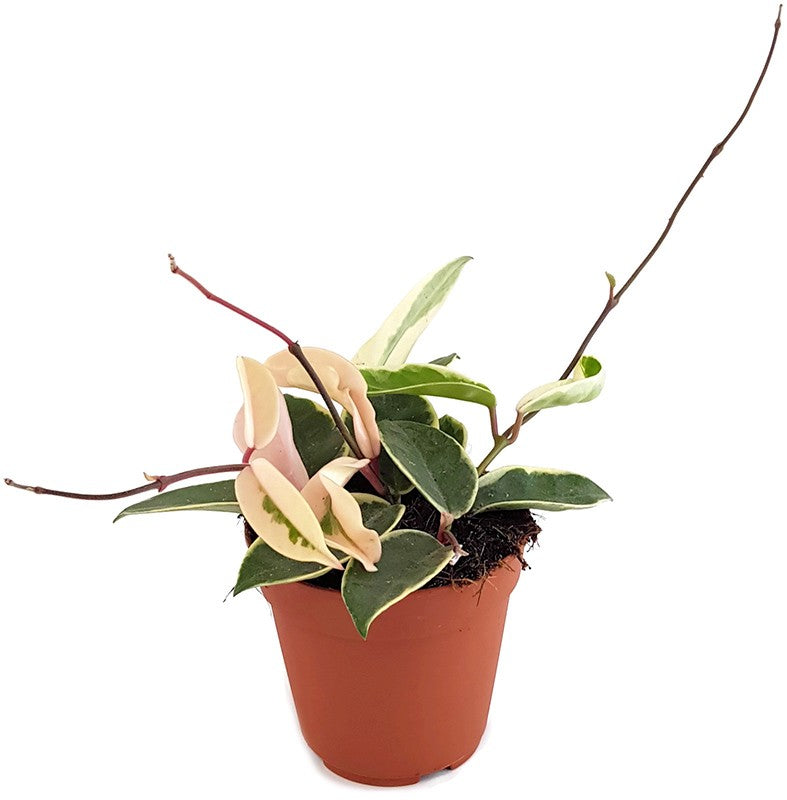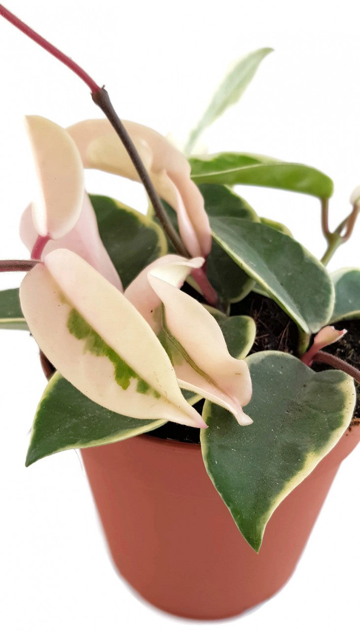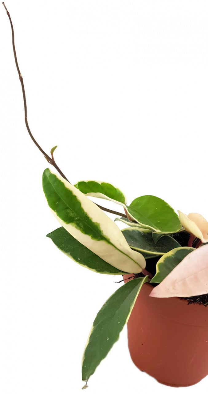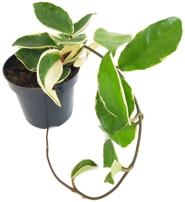 Die Hoya carnosa "Krimson Queen" ist eine besondere Zimmerpflanze, welche im Sommer an langen Ranken Blütendolden ausbildet. Die vielen Blüten der Dolde erinnern an zartes Porzellan, daher stammt ihr Zweitname Porzellanblume. Außergewöhnlich an dieser Hoya ist ihr wundervoll grün, weiß panaschiertes Laub.