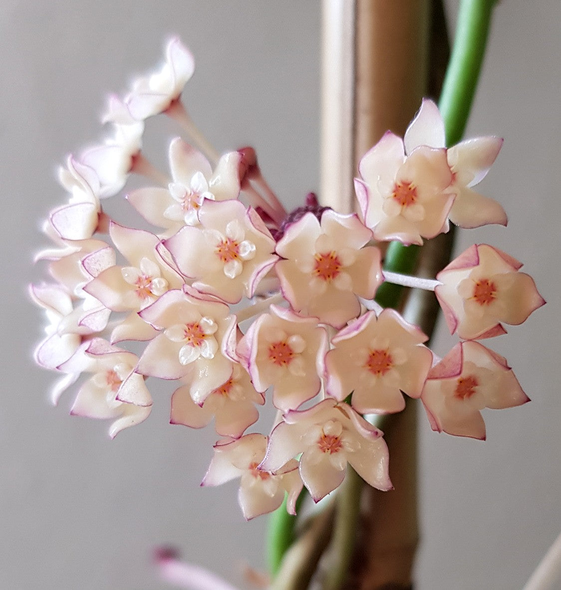 Erleben Sie die Magie des Sommers mit den atemberaubenden Blütendolden der Hoya macrophylla variegata. Wie feinstes Meissner Porzellan wirken die zarten Blüten, die an langen Ranken erblühen und von einem sanften rosa Rand umrahmt sind. Diese elegante Blütenpracht zieht jeden Betrachter in ihren Bann und schafft eine zauberhafte Atmosphäre in Ihrem Zuhause.