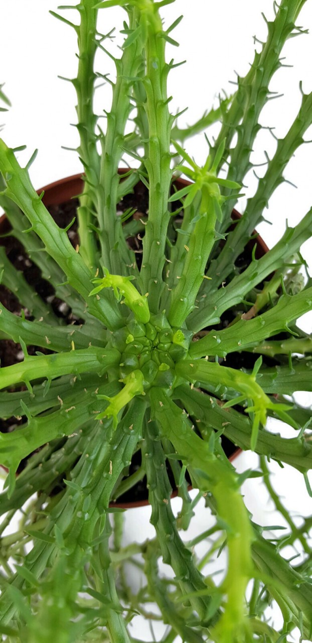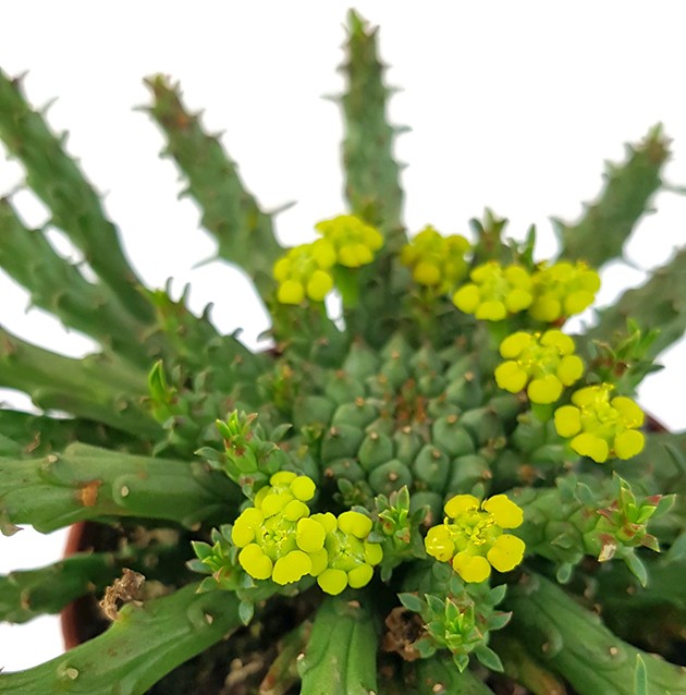 Wie viele kleinen Schlangen wachsen die vielen schmalen, grünen Triebe der Euphorbie aus der Mitte der Pflanze heraus. Dies brachte der sukkulenten Pflanze nebenbei den berühmten Namen Medusenhaupt ein. Die Euphorbia flanaganii stammt aus dem Kapland aus dem Süden Afrikas.