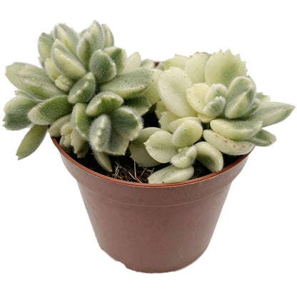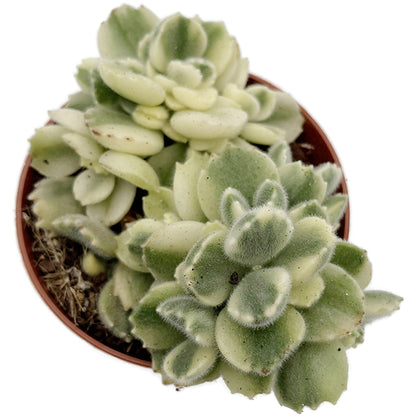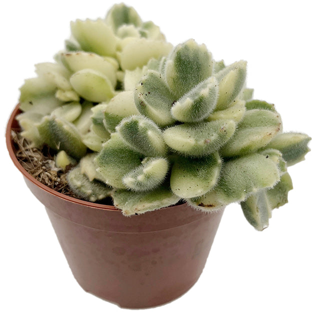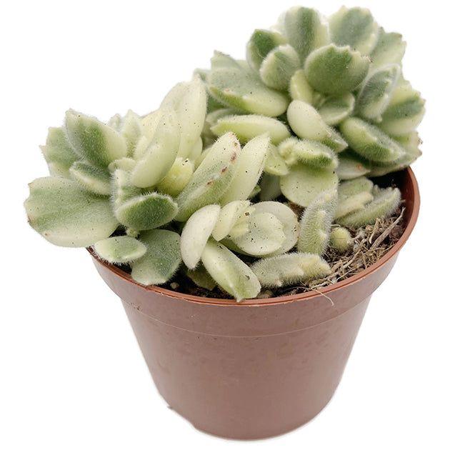 Das Cotyledon ladismithiensis variegata, auch bekannt als variegates behaartes Dickblatt, ist eine besonders charmante und seltene Variante unter den Dickblattgewächsen. Seine dicken, samtigen Blätter präsentieren sich in auffälligem Cremeweiß mit grünem Zentrum – eine außergewöhnliche Färbung, die jedem Arrangement das gewisse Etwas verleiht.