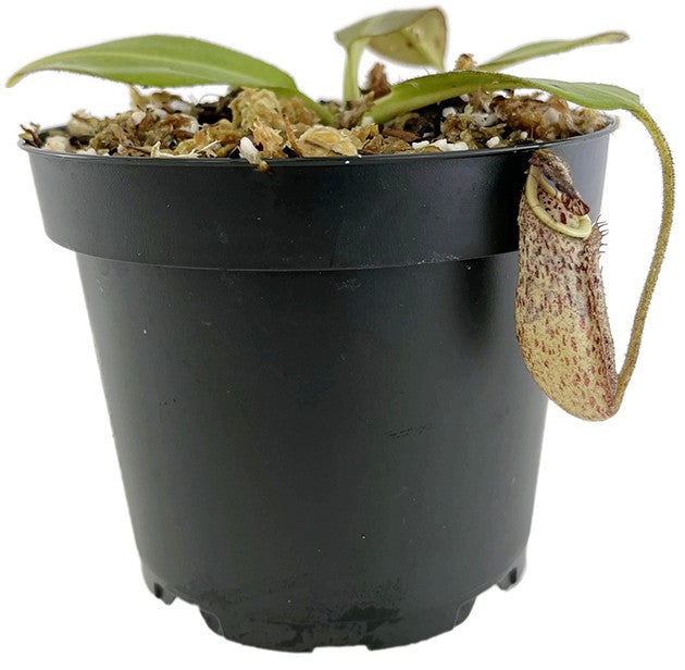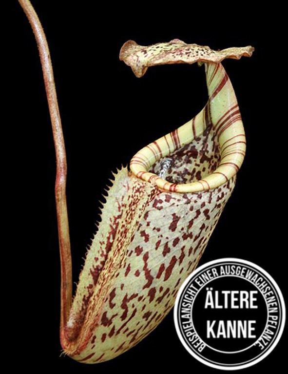 Die Nepenthes burbidgeae ist eine Kannenpflanze aus der Kategorie „Heißer Scheiß“, die Sammler von Raritäten in pure Schnappatmung versetzt. Diese außergewöhnliche Schönheit stammt aus den Höhenlagen des Mt. Kinabalu und des Mt. Tambuyukon in Borneo. Dort erreicht sie in ihrer natürlichen Umgebung Längen von bis zu 15 Metern – eine absolute Größe in jeder Hinsicht! Ihre Kannen, die wie gemalt wirken, können eine beeindruckende Länge von 25 cm erreichen und ziehen mit ihrem cremefarbenen Körper, den roten Sprenkeln und dem rot gestreiften Peristom jeden Betrachter in ihren Bann.