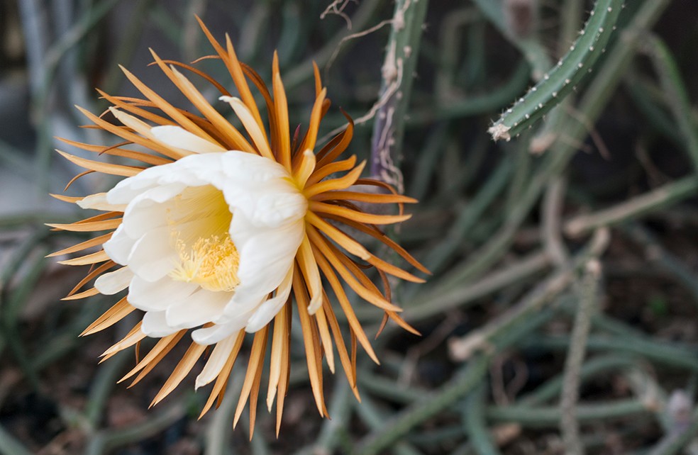 Es ist fast schon ein kleines Event, wenn eines Nachts eine Blüte zum Leben erwacht und ihre volle Schönheit präsentiert. Innen erstrahlt die Blüte in einem unschuldigen Weiß, nach außen geht die Färbung über ein warmes Gelb in ein königliches Braungelb über. Die äußeren Blütenblätter sind dornenförmig, was diese Blüten so imposant erscheinen lässt. Wie ein königlicher Kopfschmuck.