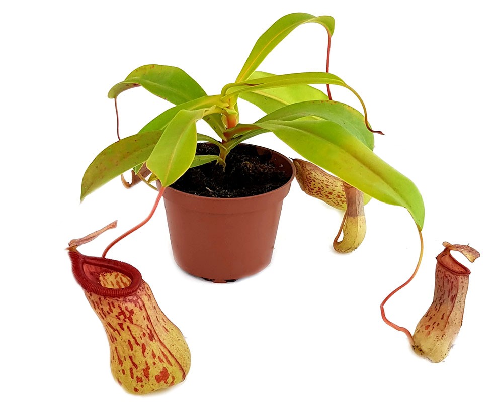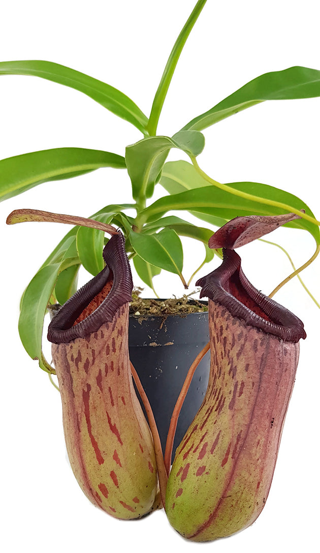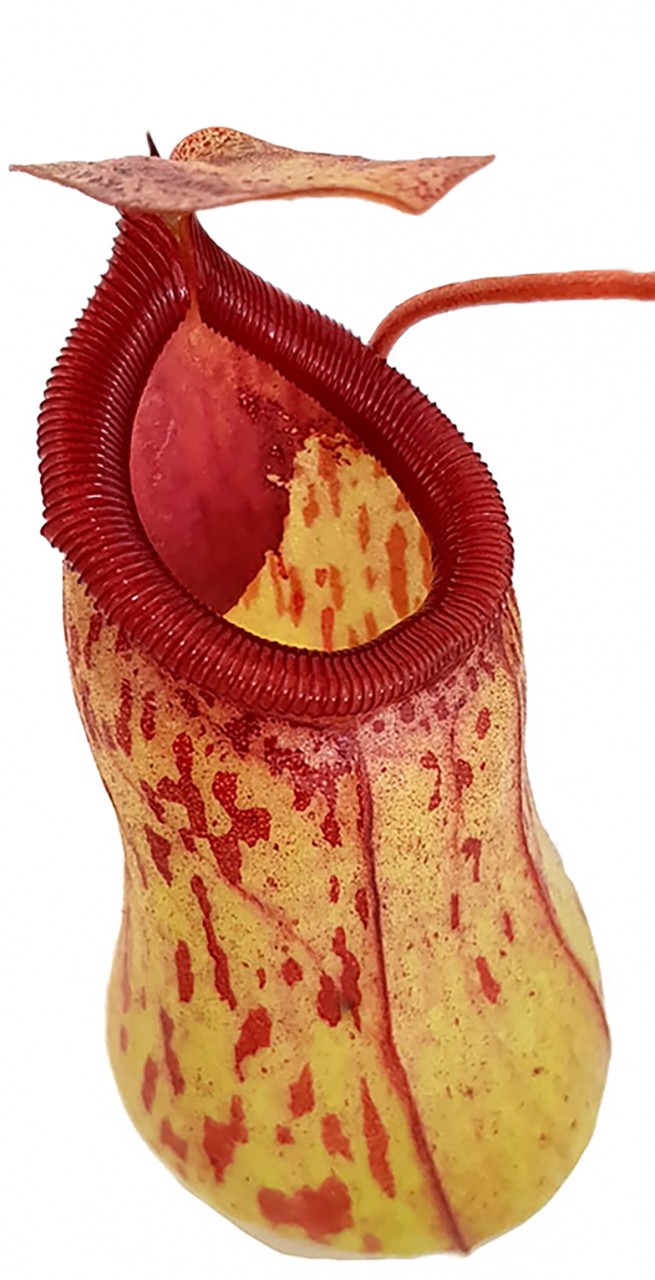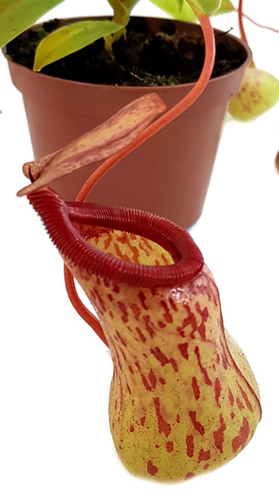Die Kannen dieser Pflanze sind besonders auffällig, sie erinnern in ihrer Form an bauchige Vasen und sind mit den charakteristischen rot-braunen Flecken verziert. Das leuchtend rote Peristom mit seiner markanten Zahnung verleiht den Kannen eine besondere Eleganz. Für Pflanzenliebhaber, die Wert auf optische Highlights legen, ist die Nepenthes St. Pacificus eine wertvolle Bereicherung für jede Sammlung.