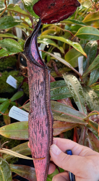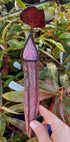 Nepenthes ramispina x spectabilis vereint das dunkle, elegante Erscheinungsbild beider Elternteile zu einer beeindruckenden fleischfressenden Pflanze, die sich besonders für Liebhaber kräftiger Kontraste eignet. Die charakteristisch schokobraunen bis beinahe schwarzen Kannen zeigen markante, dunkle Flecken, die durch ihre matte Oberfläche eine fast samtige Wirkung erzielen – ein echtes Highlight in jeder Sammlung.