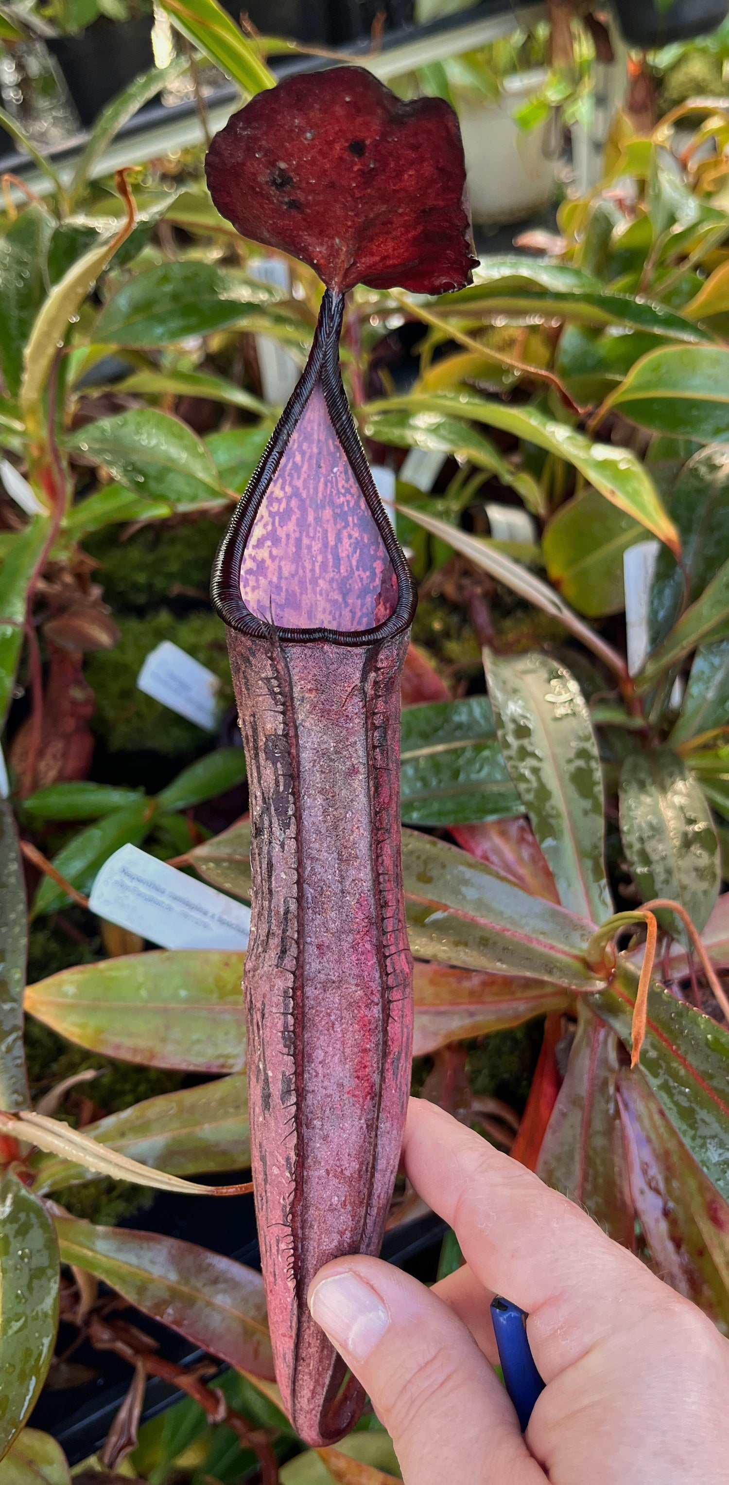 Die Kreuzung stammt aus der Zucht von Borneo Exotics, wobei die verwendete Nepenthes ramispina eine exzellente Linie mit der Sammlungsnummer BE-0425 ist. Die Kannen dieser Karnivore wirken nicht nur exotisch, sondern bringen durch ihre klare Form und die elegante Färbung eine gewisse Ruhe und Tiefe in jede Hochland-Vitrine. Ihre Herkunft und genetische Zusammensetzung verleihen ihr eine gute Anpassungsfähigkeit an klassische Hochlandbedingungen – Temperaturen zwischen 18–25 °C am Tag und einer nächtlichen Abkühlung auf etwa 10–15 °C sind ideal. Hohe Luftfeuchtigkeit ist, wie bei vielen Hochland-Nepenthes, essenziell für kontinuierliche Kannenbildung.