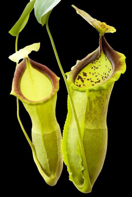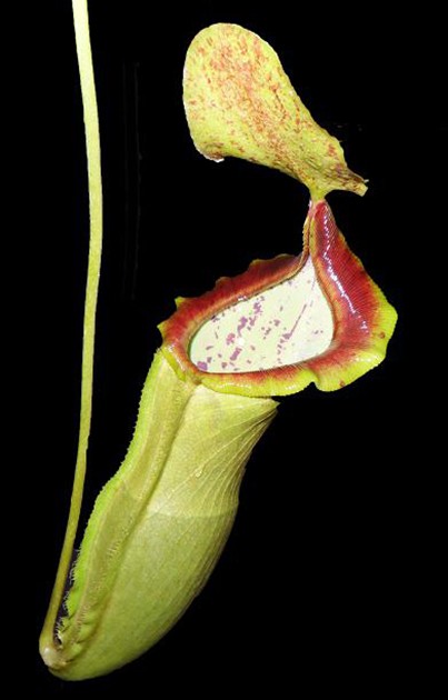 Die Kannen leuchten außen in hellem Grün, während das Innere von feinen braunen Sprenkeln verziert ist. Besonders eindrucksvoll ist das stark geschwungene, auffällig breite Peristom, das nicht zurückrollt, sondern dauerhaft aufgeweitet bleibt. Mit zunehmendem Alter färbt es sich rostrot und erzeugt einen atemberaubenden Kontrast zwischen der Krugfarbe und dem Peristom – ein Effekt, der sofort ins Auge fällt.