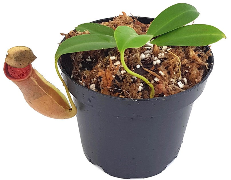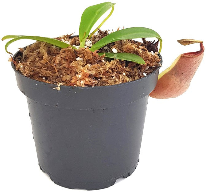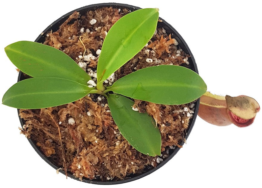 Die Nepenthes spathulata x Nepenthes campanulata ist eine Hybride von außergewöhnlicher Eleganz, die sich durch ihre bauchigen Krüge und ein spektakuläres Peristom auszeichnet. Schon junge Pflanzen zeigen eine intensive Ausfärbung und machen diese Kreuzung zu einem Highlight für jede Sammlung.