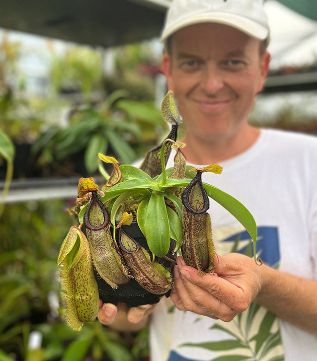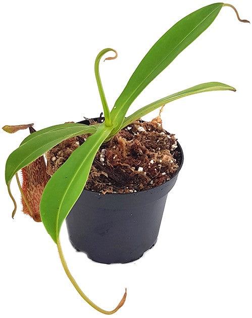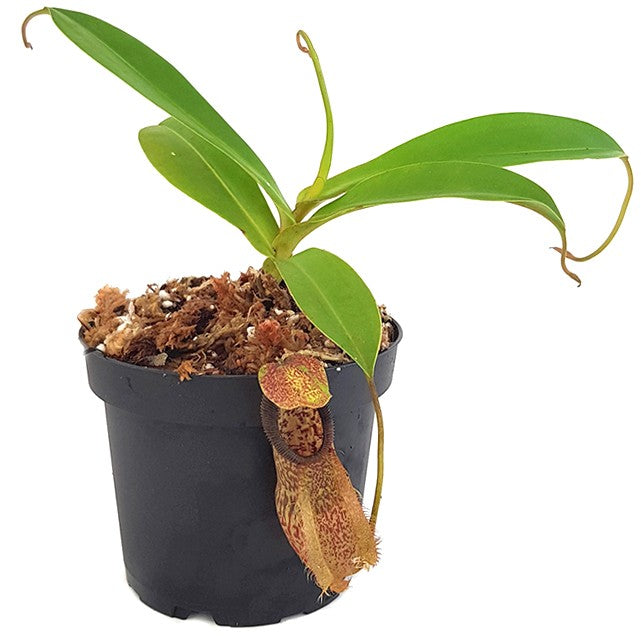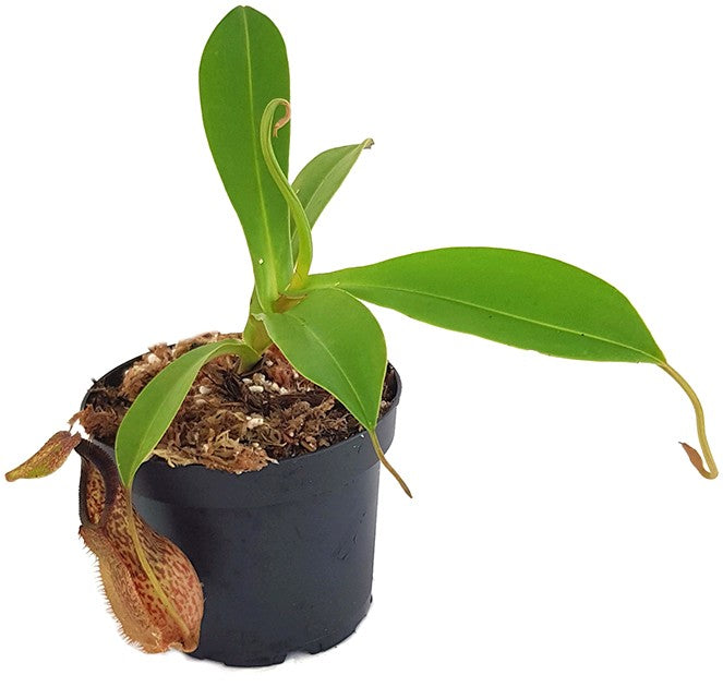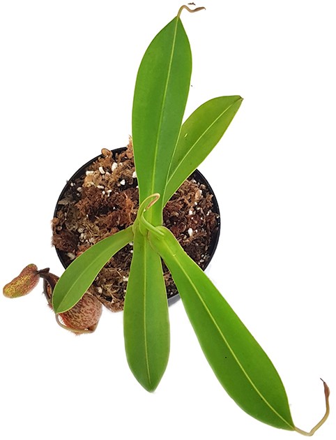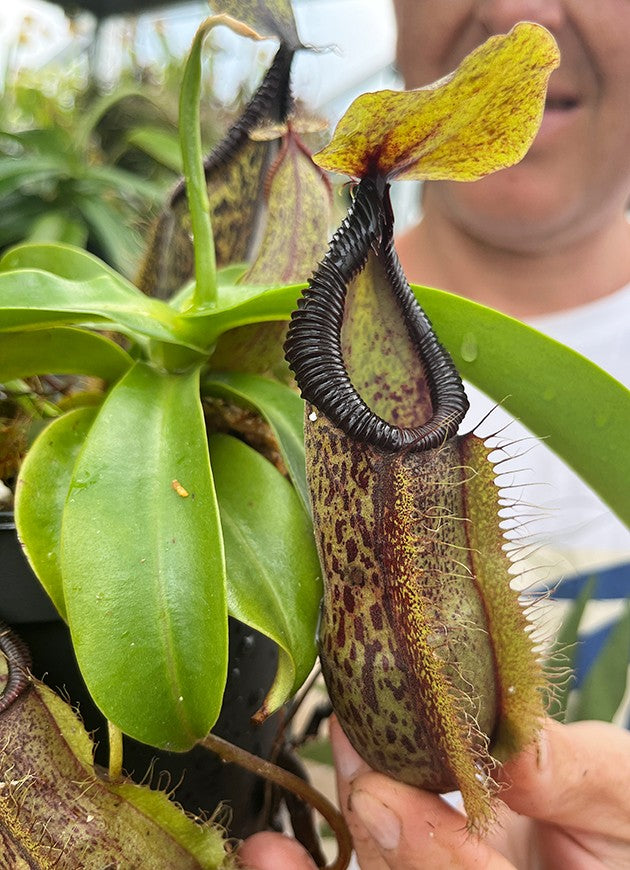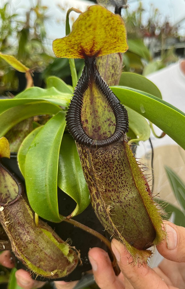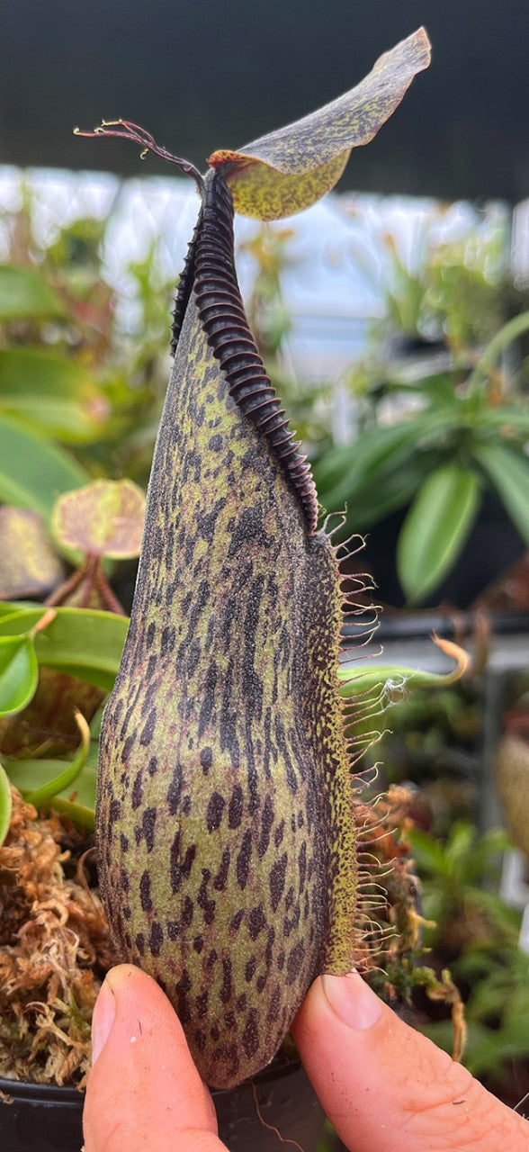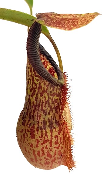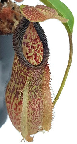 Nepenthes spathulata x hamata BE-3843 ist eine formvollendete Kreuzung. Als weiblicher Elternteil wurde ein ausgewählter Klon der Nepenthes spathulata mit einer männlichen Gng.Tambusisi-Form der Nepenthes hamata gekreuzt. Daraus sind diese schönen Pflanzen entstanden. Die Krüge dieser Kannenpflanze sind mit einer olivgrünen Grundfarbe und weinroten Sprenkeln gefärbt. Das Peristom ist sehr schön ausgeprägt und ebenfalls in ein dunkles Weinrot getaucht.