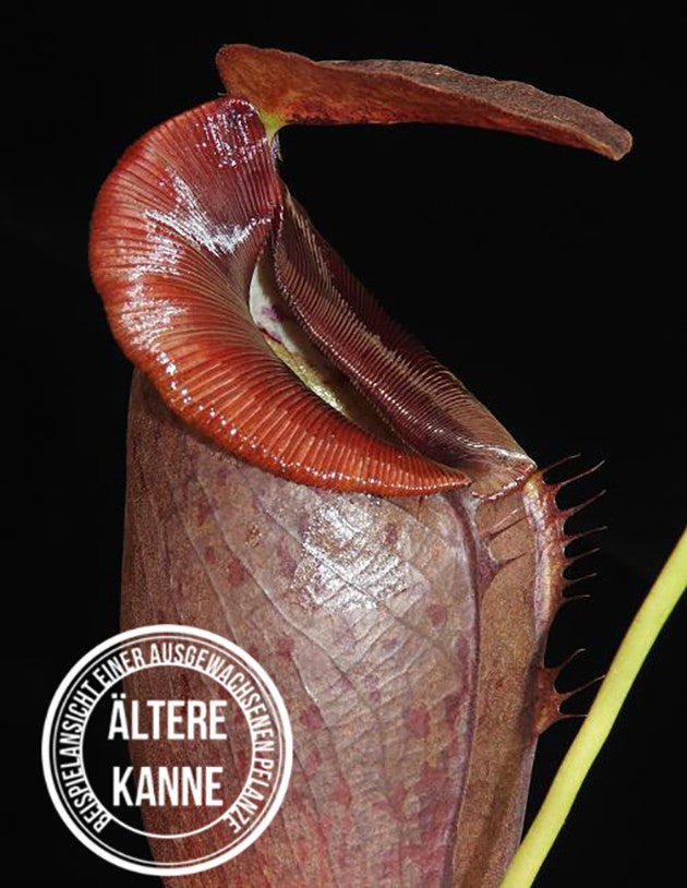 Das ausladende Peristom dieser Schönheit präsentiert sich in einem tiefen Rotton, der beinahe ins Violette übergeht und breit absteht. Die Kanne der Pflanze ist ebenso in einem dunklen Rot getaucht. Beachtenswert ist die bemerkenswerte Variation in der Färbung - von grünen Kannen mit zarten, verworrenen Rottönen bis hin zu anderen faszinierenden Farbnuancen.