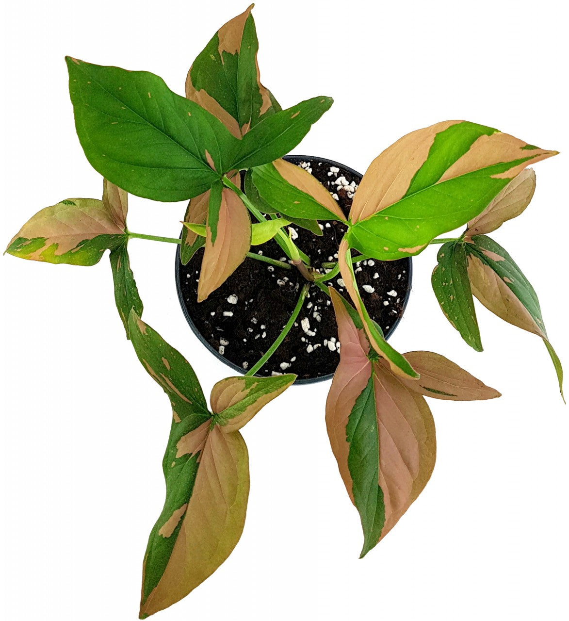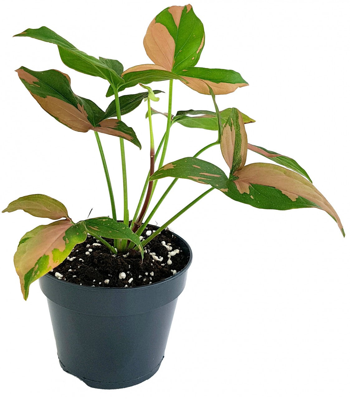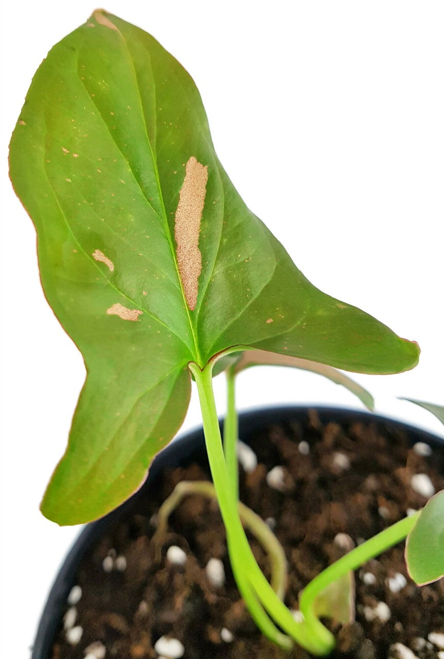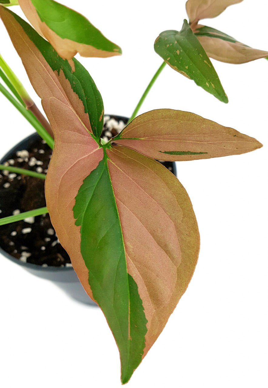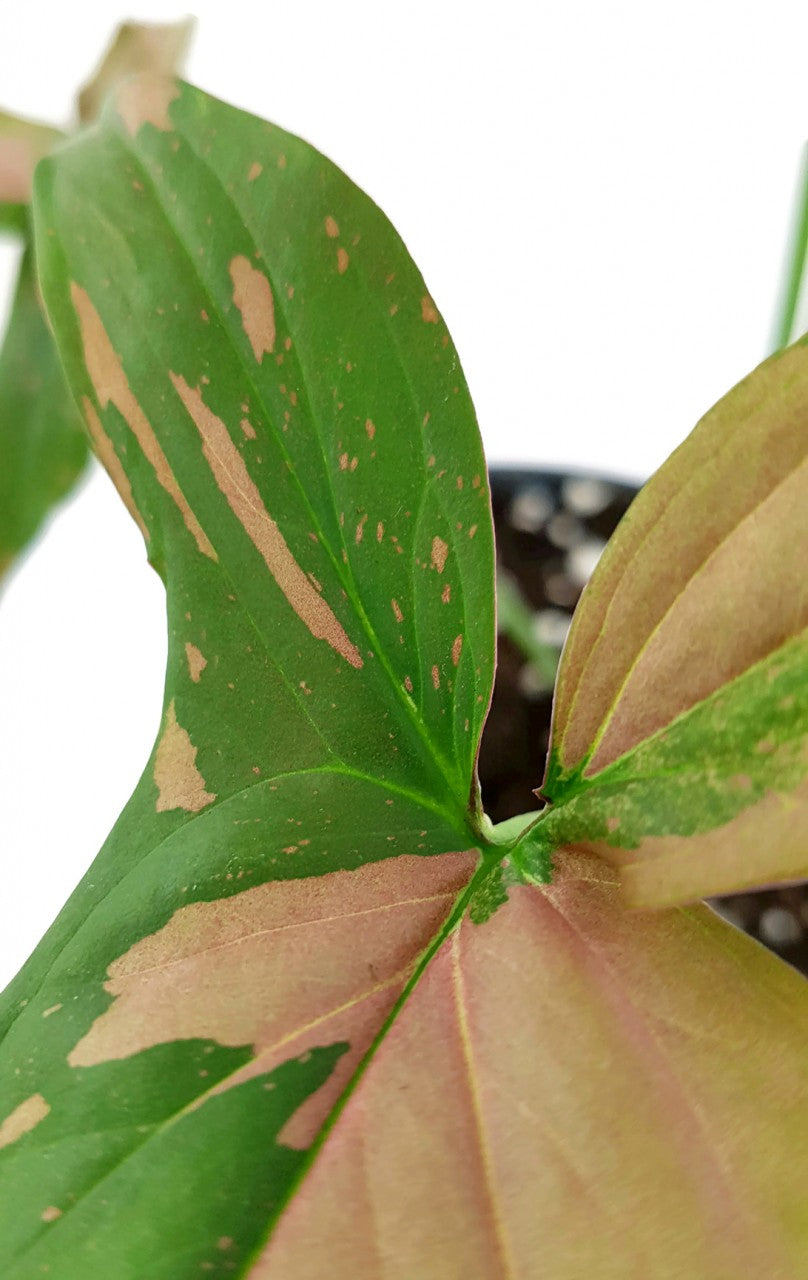 Syngonium 'Red Spot' wird das neue Highlight Ihrer Pflanzensammlung. Die Purpurtute ist wegen ihrer rosa Flecken und Sprenkel auf ihren grünen Blättern sehr beliebt. Mit jedem neuen, kunstvoll gestalteten Blatt können Sie sich auf eine weitere Entdeckungsreise begeben. Der Farbanteil zwischen rosa und sanftem grün unterscheidet sich auf jedem Blatt. Ebenso abwechslungsreich überlassen sich größere Flecken und winzig kleine Spritzer die Blattflächen. Kein Wunder, dass sich Syngonium 'Red Spot' zu einer begehrten Sammlerpflanze entwickelt hat.
