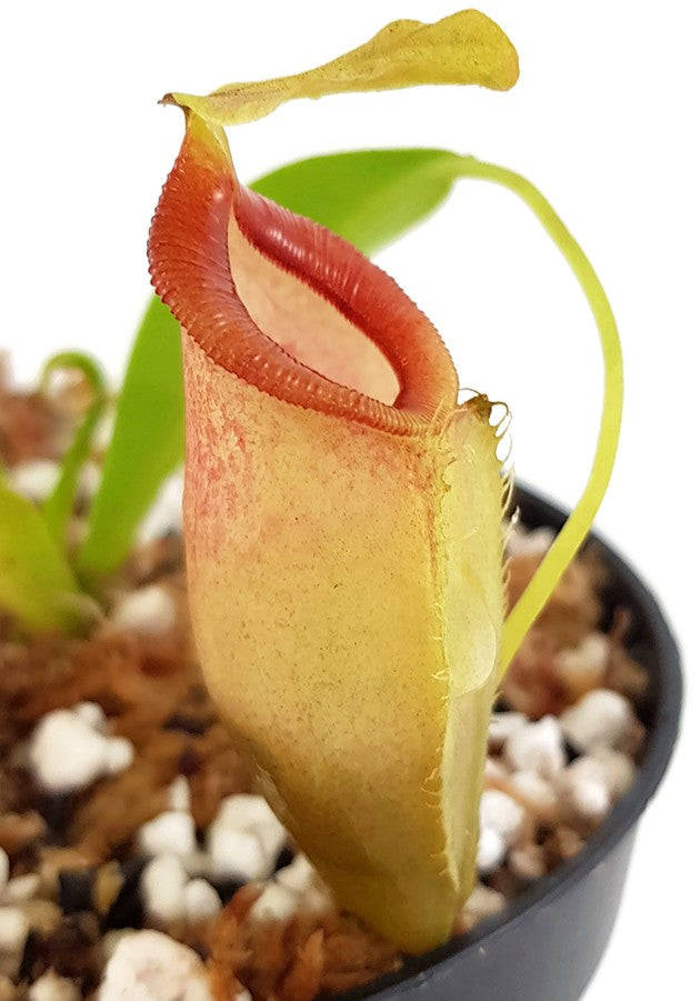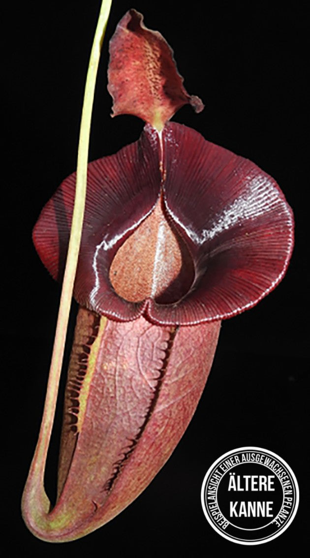 Nepenthes spathulata x jacquelineae ist eine ganz neue und zugleich herausragende Kreuzung von Borneo Exotics. Gerade ungewöhnliche und breite Peristome ziehen Sie magischen in den Bann, dann wird Ihr Herz vor Freude bei dieser Hybride hüpfen. Das tiefrote Peristom rollt sich bei diesen sorgfälltig selektierten Klon nicht aus und bleibt breit stehen. Eine wahre Augenweide und in jeder Hinsicht außergewöhnlich.