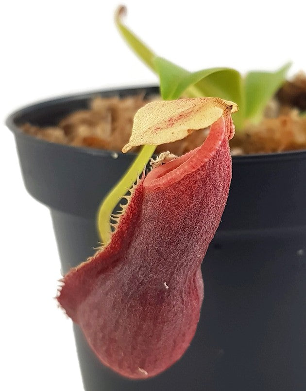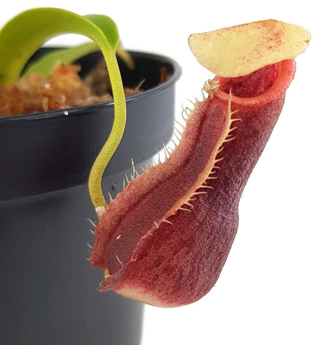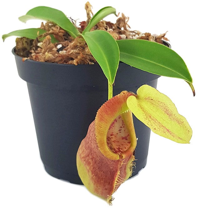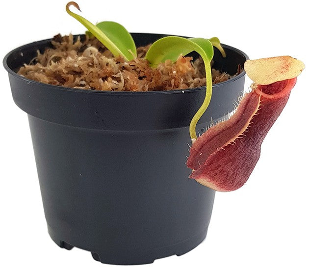 Diese extravagante Kannenpflanze mag eine Umgebung mit erhöhter Luftfeuchtigkeit, dies erreichen Sie ganz leicht indem Sie die Nepenthes von Zeit zu Zeit mit Wasser aus einer Sprühflasche benebeln.