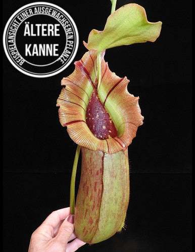 Nepenthes burkei x robcantleyi bildet wunderschön gefärbte dunkle Krüge mit einem breiten Peristom aus. Ein definitiver Blickfänger!