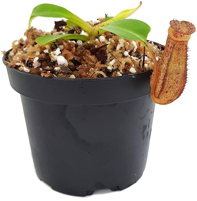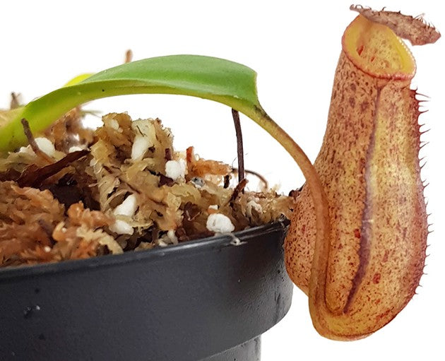 Diese extravagante Kannenpflanze mag eine Umgebung mit erhöhter Luftfeuchtigkeit, dies erreichen Sie ganz leicht indem Sie die Nepenthes von Zeit zu Zeit mit Wasser aus einer Sprühflasche benebeln.