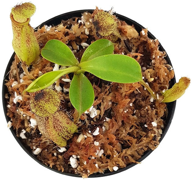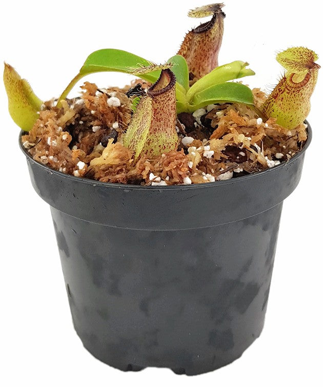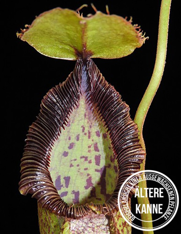 Erfreuen Sie sich an dem ungleichmäßig gerippten Peristom Ihrer exotischen Kannenpflanze. Unterstützt wird dieses aufregende Äußere von den charakteristischen dunkelroten Sprenkeln, die sich unregelmäßig auf den grünen Kannen verteilen. Diese Hybride, die in Hochland-Bedingungen gedeiht, erfordert kühle Temperaturen und hohe Luftfeuchtigkeit, um optimal zu wachsen.