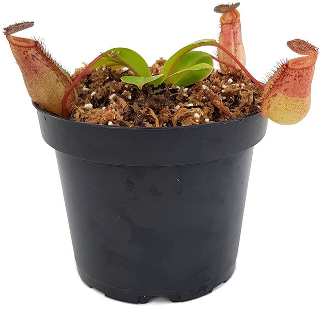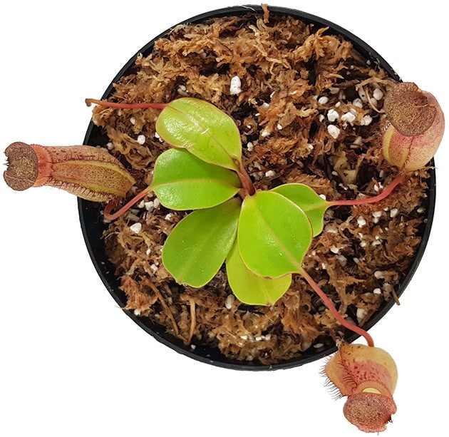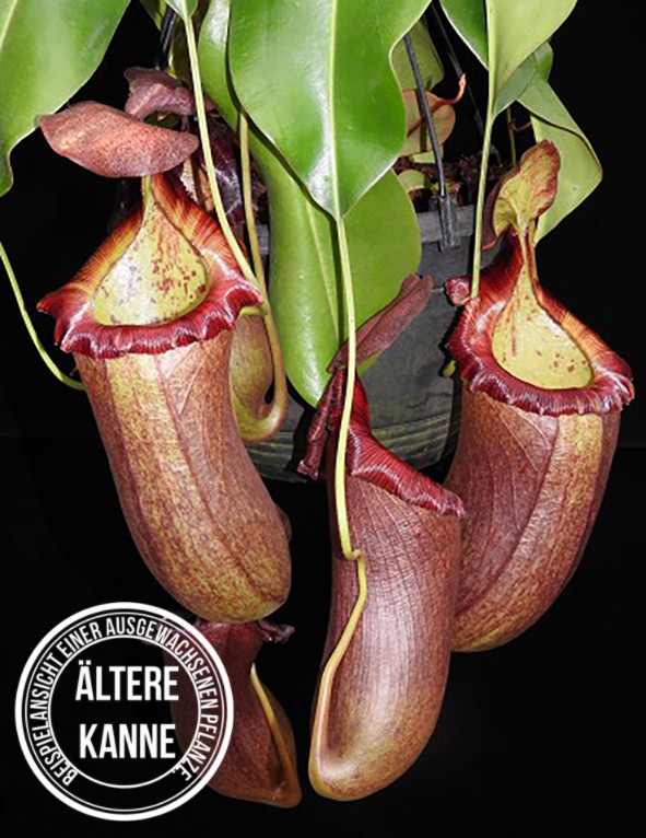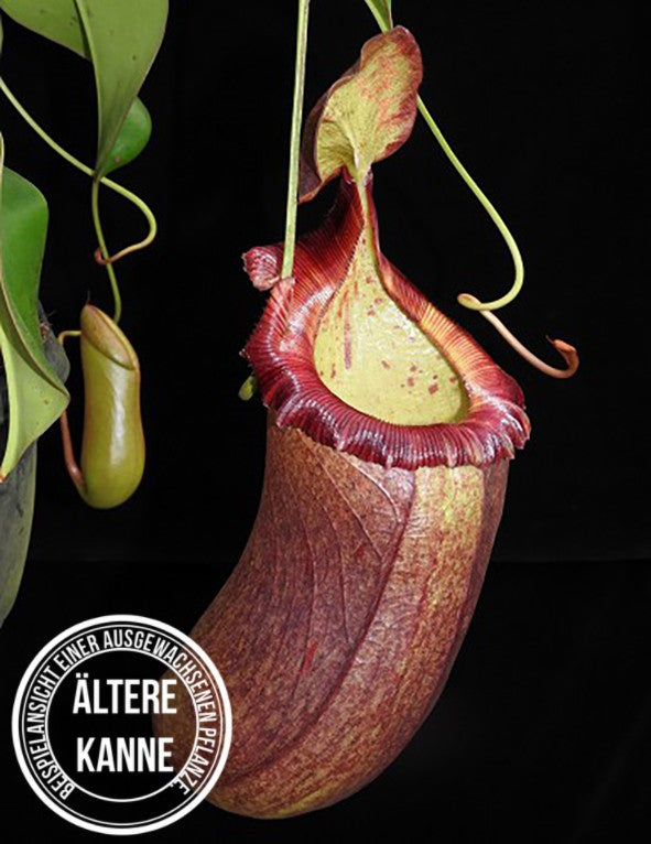 Was diese Kannenpflanze so begehrenswert macht, ist die Kombination aus stark bauchigen, farbintensiven Krügen und einer klar strukturierten Silhouette. Die Kannen erreichen nicht nur beachtliche Größen, sondern zeigen oft eine eindrucksvolle Farbtiefe – von rötlich-braunen bis fast violetten Tönen, je nach Lichtintensität. Das kräftige Peristom bildet einen formschönen Abschluss und unterstreicht die charaktervolle Optik dieser Hybride. Gerade in der Reife zeigt sie eine Ausdrucksstärke, die man so nur bei wenigen Nepenthes findet.