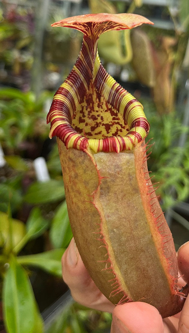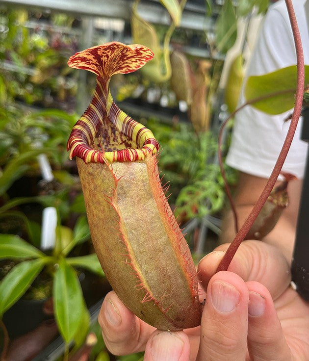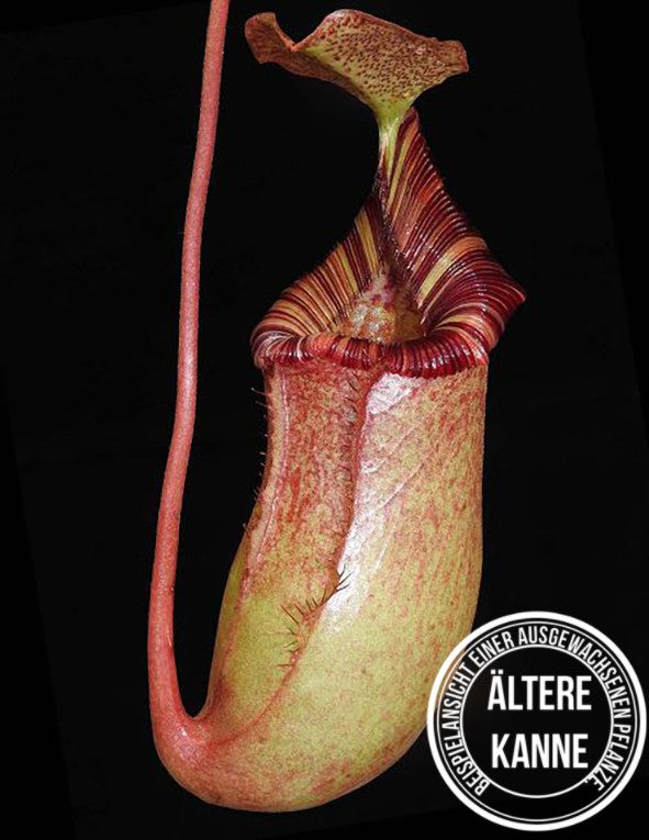 Nepenthes sibuyanensis x (veitchii x lowii) ist eine außergewöhnliche Hybride, die das Potenzial besitzt, besonders eindrucksvolle Kannen zu produzieren, wenn sie ausgewachsen ist. Und dieses Versprechen hält sie definitiv ein. Unsere großen Exemplare beeindrucken mit solch farbenfrohen Kannen, dass Worte kaum ausreichen, um ihre Schönheit zu beschreiben. „Feuerwerk“ und „Blickmagnet“ treffen es wohl am besten.