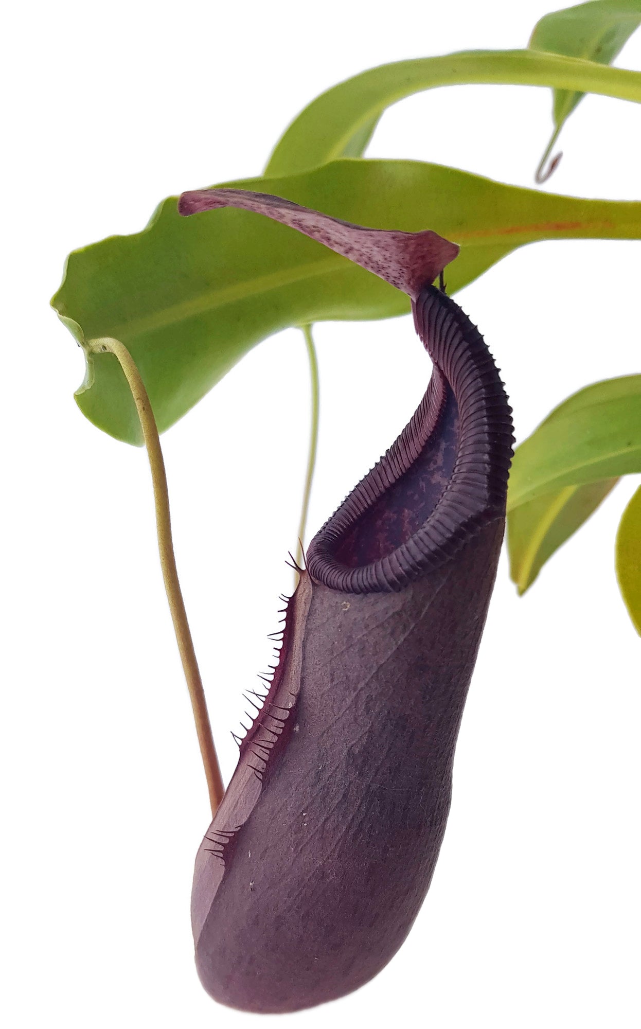Die Nepenthes (singalana x ventricosa) x robcantleyi ist eine besonders elegante Hybride, die durch ihre tiefen, dunklen Farben und ihre ausgeprägte Kannenform hervorsticht. Diese eindrucksvolle Kreuzung verdankt ihre auffällige Färbung eindeutig der Vaterpflanze, der imposanten schwarzen Nepenthes robcantleyi, die auch als „King of Spades“ bekannt ist. Das genetische Erbe dieser seltenen Pflanze verleiht der Hybride ihre robuste Struktur und kräftige Farbintensität.
