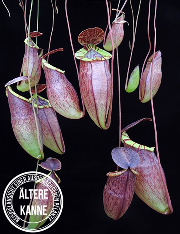 Diese Nepenthes kultiviert man am besten im Ampeltopf an halbschattigen bis sonnigen Plätzen in der Wohnung, Balkon oder dem Gewächshaus. Eine direkte Sonneneinstrahlung sollte jedoch vermieden werden. Bei guten Bedingungen kann die Kletterpflanze 2 - 3 Meter hoch werden und ist ein absoluter Eyecatcher.