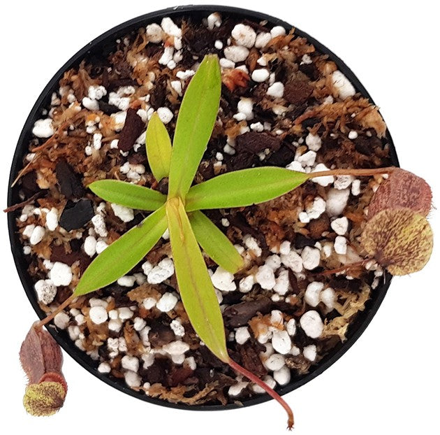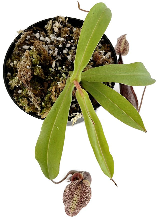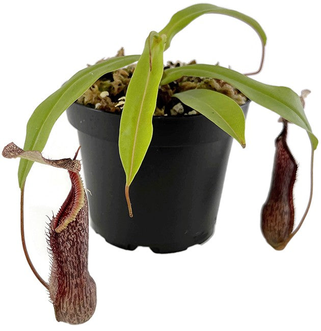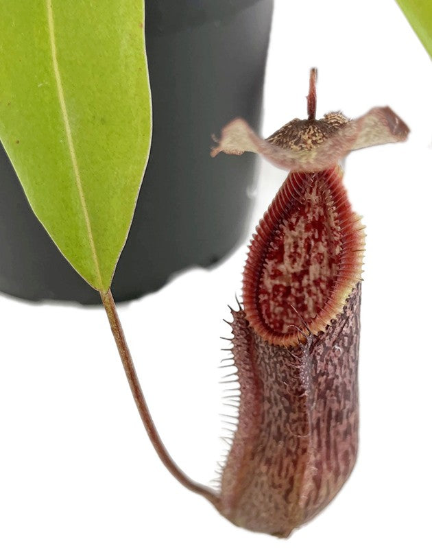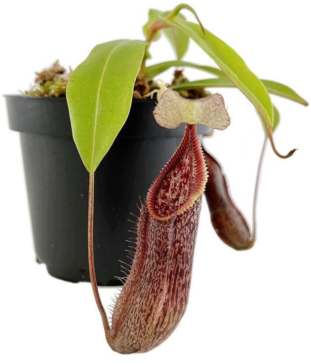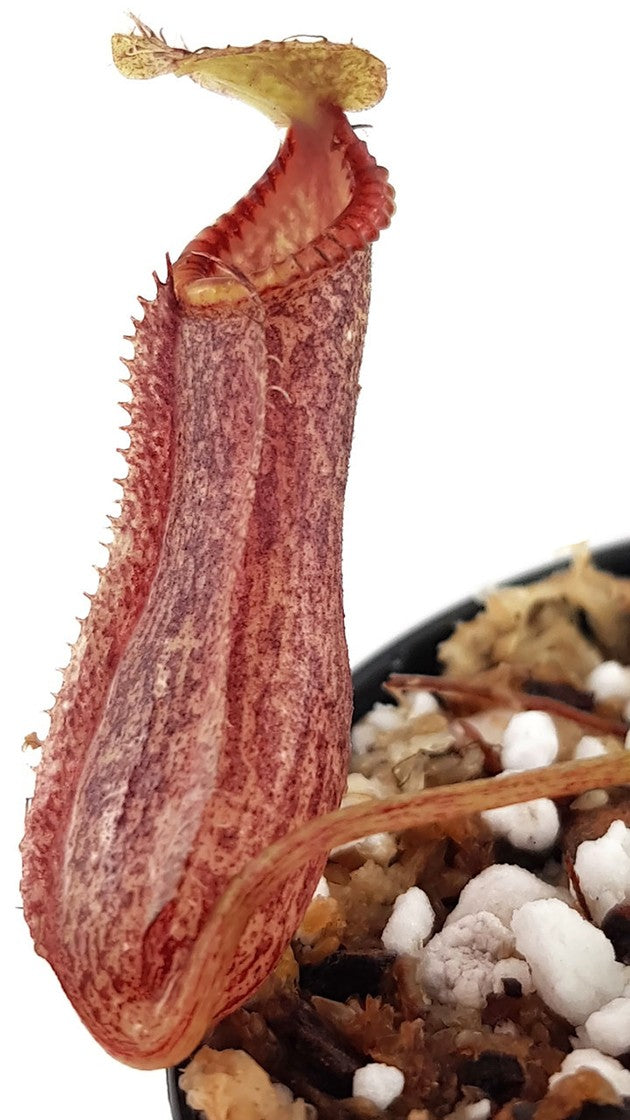 Nepenthes singalana x hamata ist eine neue und erstklassige Hybride von Borneo Exotics. Die Vaterpflanze ist ein ausgewählter Klon der Nepenthes hamata "Gunung Tambusisis". Diese Kannenpflanzenart besitzt die gefürchtetsten Zähne unter den Nepenthes und die unheimlichste dunkle Färbung unter den hamatas. Gekreuzt mit der Nepenthes singalana ergibt sich eine eindrucksvolle Hybride mit einem stark gerippten Peristom, das teilweise leichte Farbverläufe besitzt. Hinzu kommt das tolle, gleichmäßige Muster auf den Kannen. Diese Kannenpflanzenhybride werden Sie in Ihrer Sammlung nicht bereuen.