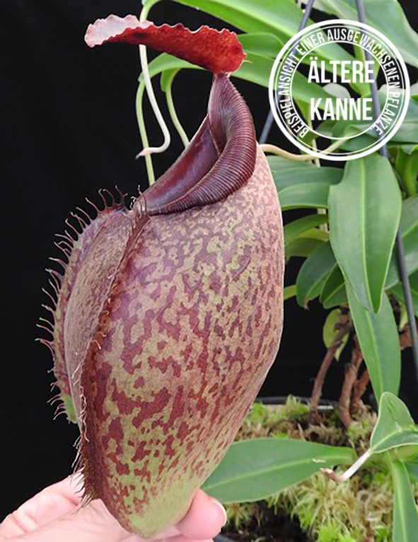 Die Nepenthes spathulata x aristolochioides wird ohne Verdauungssekret in den Kannen geliefert. Bei Erhalt können Sie die Kannen bis zu einem Drittel mit Regenwasser auffüllen. Es ist jedoch zu beachten, dass eine Lieferung der Pflanze mit bereits ausgebildeten Kannen nicht garantiert werden kann, da dies von den Wachstumsbedingungen abhängig ist.