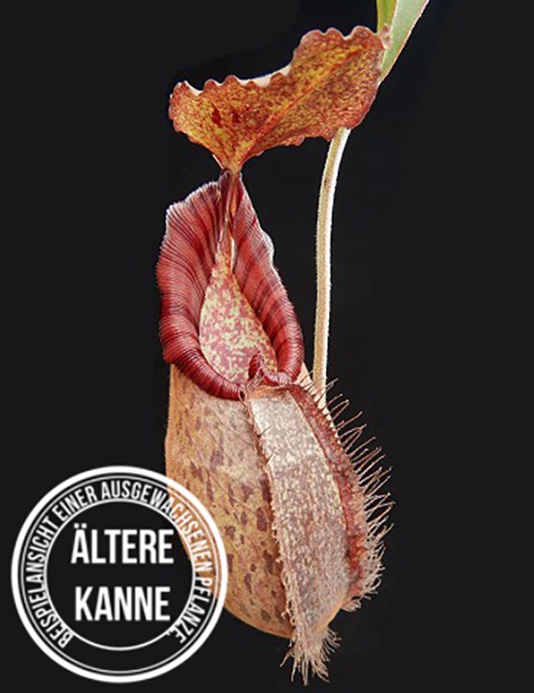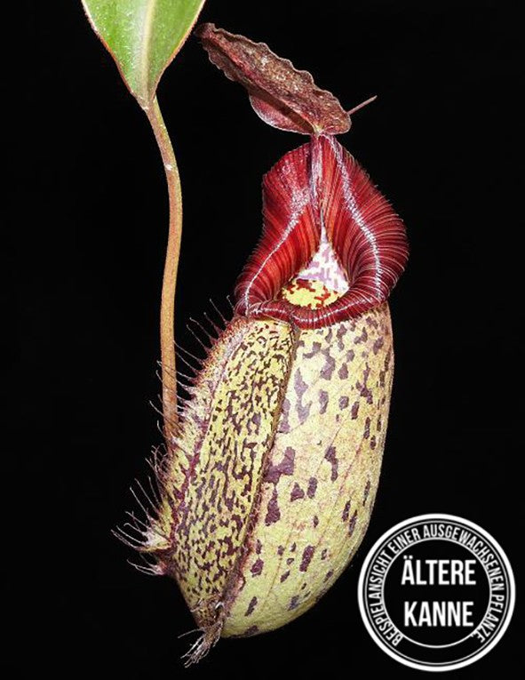 Die Nepenthes robcantleyi x (aristolochioides x spectabilis) ist nicht nur ein visuelles Highlight, sondern auch ein Symbol für die hohe Kunst der Hybridisierung. Ihre Kannen sind ein echter Hingucker, geprägt von der unvergleichlichen Farbintensität und der robusten Struktur, die diese Pflanze zu einer Bereicherung für jede Sammlung macht. Besonders hervorzuheben ist das breite, auffällige Peristom, das im reifen Zustand eine tiefe, fast schwarze Farbe annimmt und so die Eleganz und Stärke dieser Hybride unterstreicht.