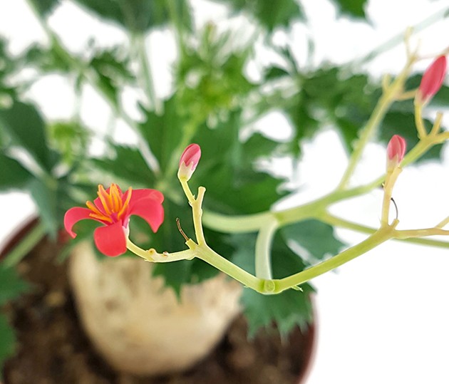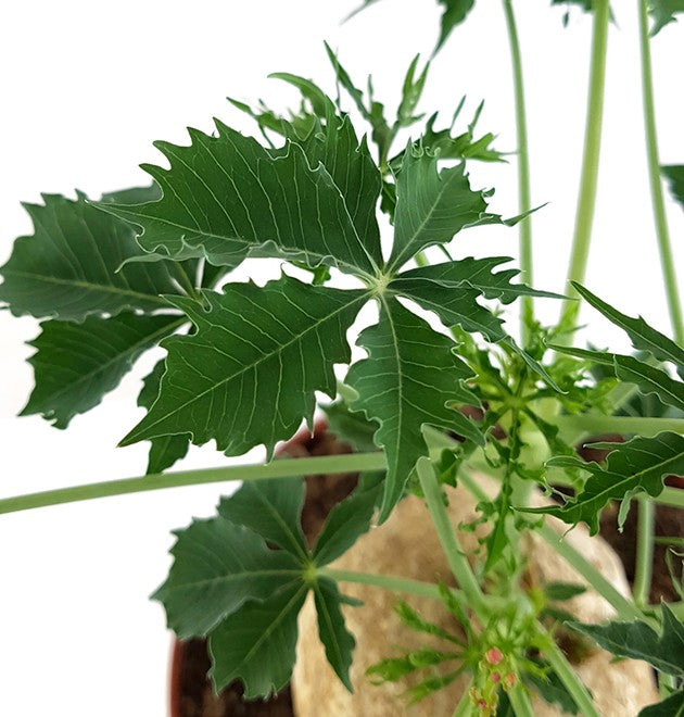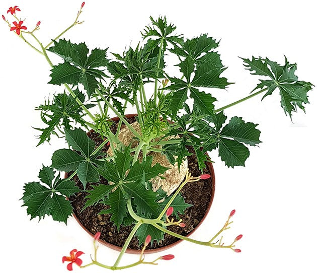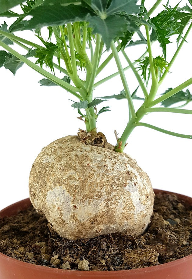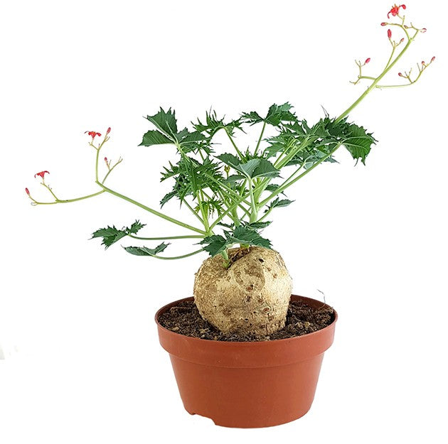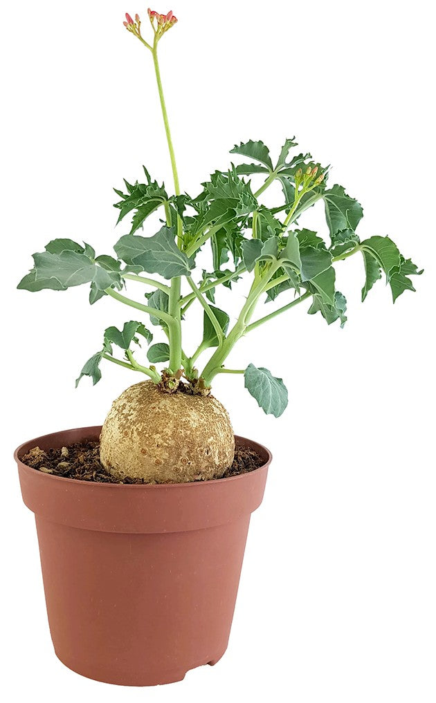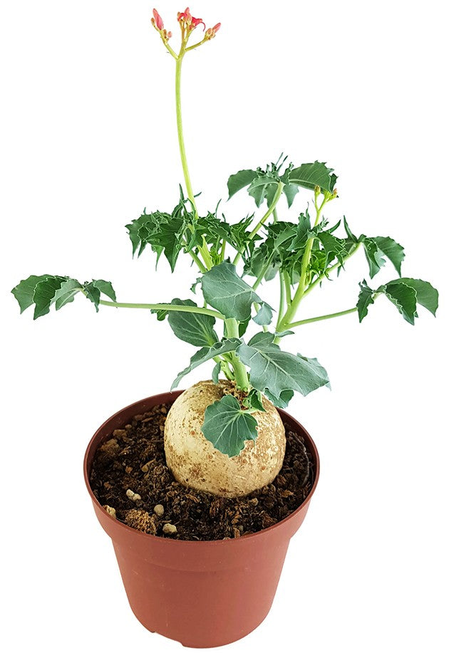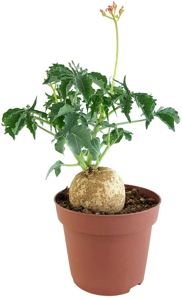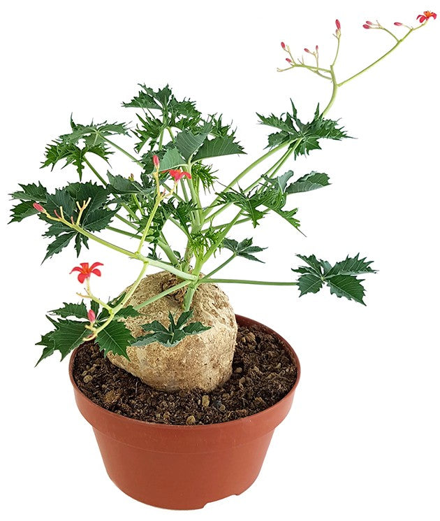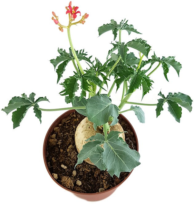 Lassen Sie mit Ihrer Caudexpflanze, auch bekannt als Jathropha berlandieri, ein unverwechselbares und exotisches Ambiente in Ihrem Zuhause entstehen. Die tief gelappten Blätter werden sich über der eindrucksvollen Knolle ausbreiten und einen atemberaubenden Anblick zaubern. Sobald die zierlichen Blüten erscheinen, wird Ihre Jatropha berlandieri für einen zauberhaften roten Farbtupfer in Ihrer Pflanzensammlung sorgen.
