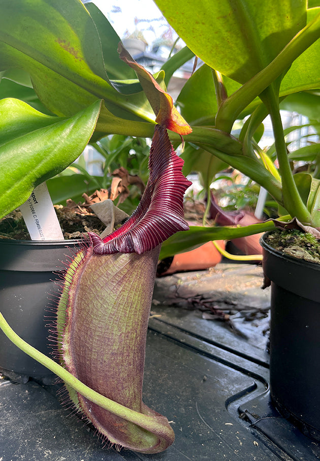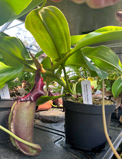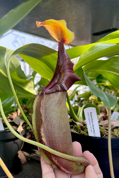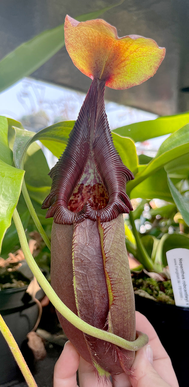 Die Nepenthes robcantleyi x Nepenthes ovata ist eine prächtige Hochlandhybride, die zwei außergewöhnliche Arten miteinander verbindet. Von der Nepenthes robcantleyi, auch bekannt als „Queen of Hearts“, erbt sie ihre majestätische Ausstrahlung und dunkle Farbintensität. Die Nepenthes ovata bringt ihre markante Form und den charakteristischen Schwung des Peristoms ein. Zusammen entsteht eine Pflanze von außergewöhnlicher Schönheit und Vitalität.