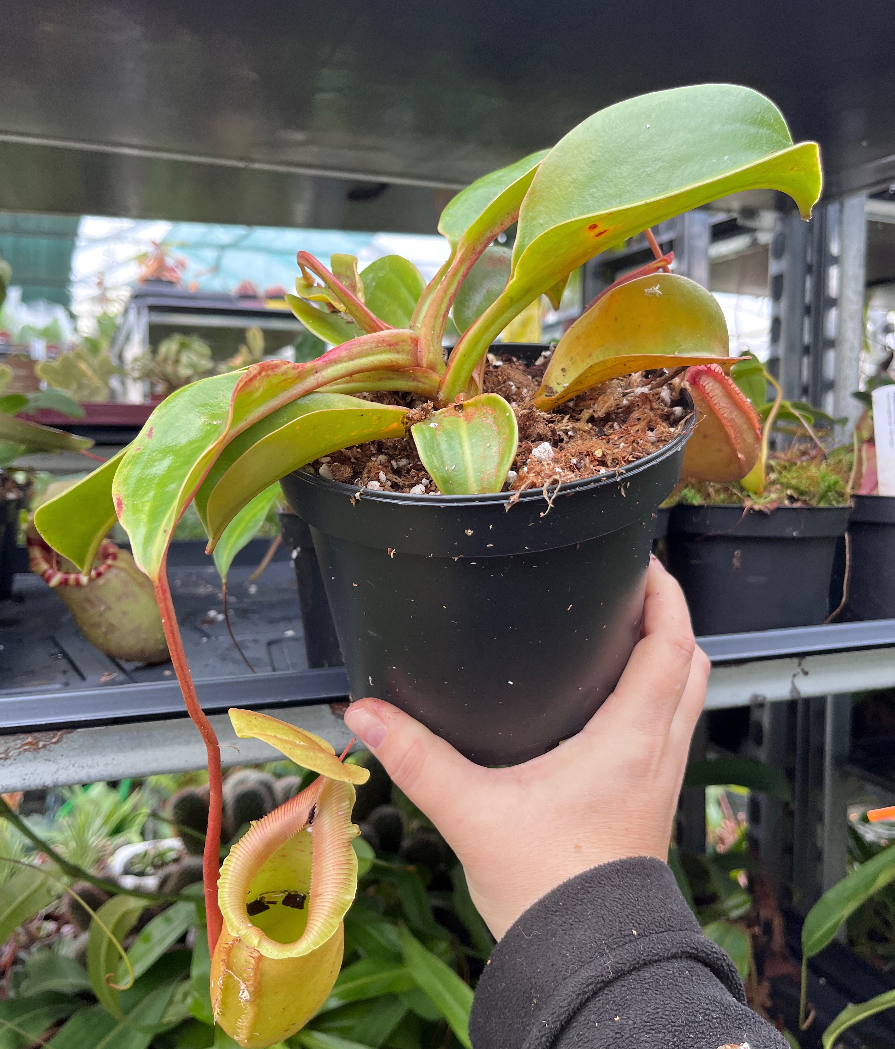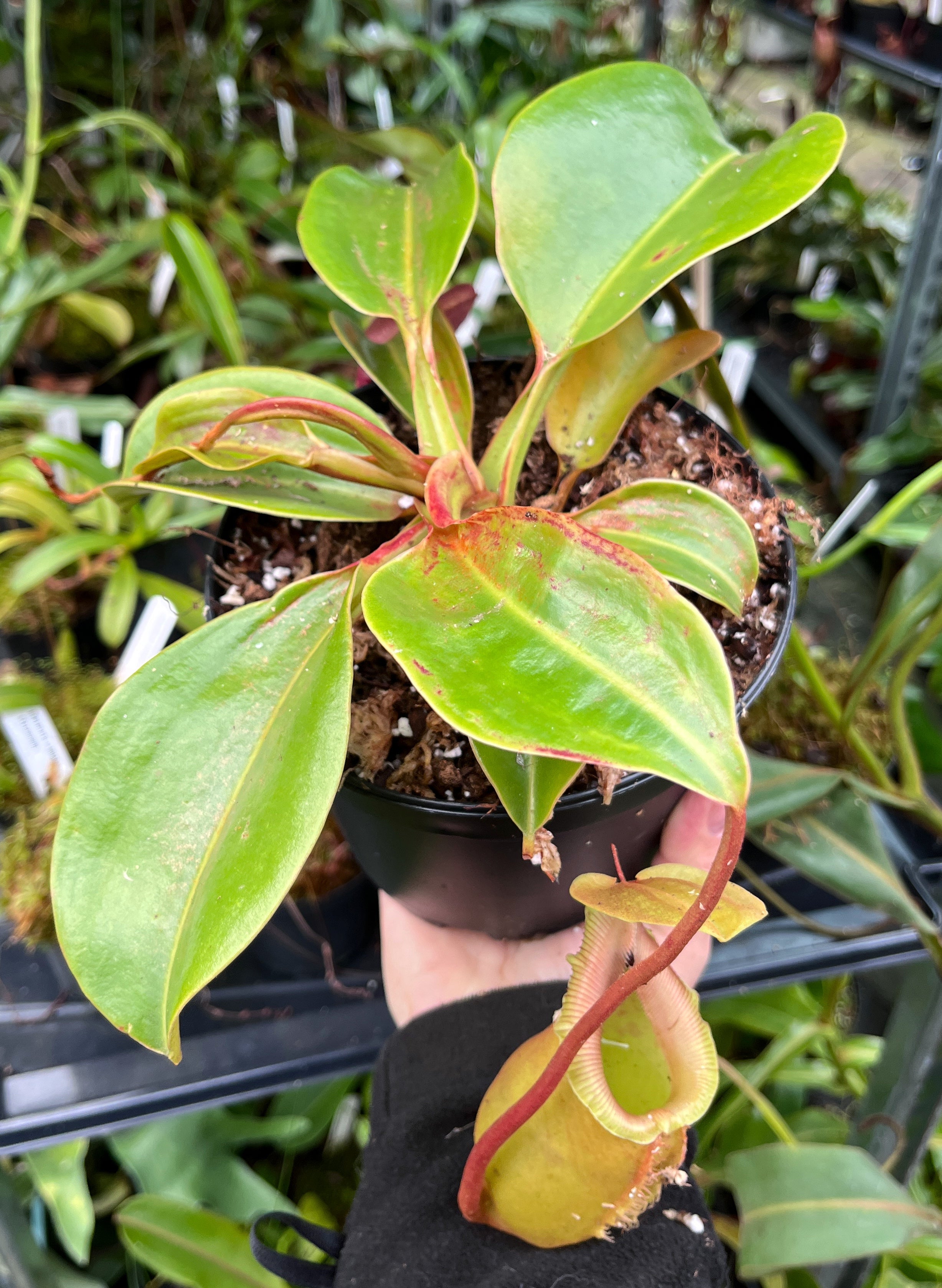 Die Nepenthes robcantleyi x (sibuyanensis x ventricosa) ist ein absolutes Showpiece, das in jeder Sammlung zum strahlenden Mittelpunkt wird. Diese außergewöhnliche Hybride beeindruckt mit ihren imposant bauchigen Kannen, die mühelos andere Nepenthes in den Schatten stellen. Die gigantische Nepenthes robcantleyi als Mutterpflanze verleiht ihr nicht nur die beeindruckende Größe, sondern auch eine robuste Struktur. Ergänzt wird diese durch die eleganten Gene der Hybride Nepenthes sibuyanensis x ventricosa (Klon #9), die mit raffinierten Formen und einer leuchtenden roten Ausfärbung den perfekten Akzent setzt.