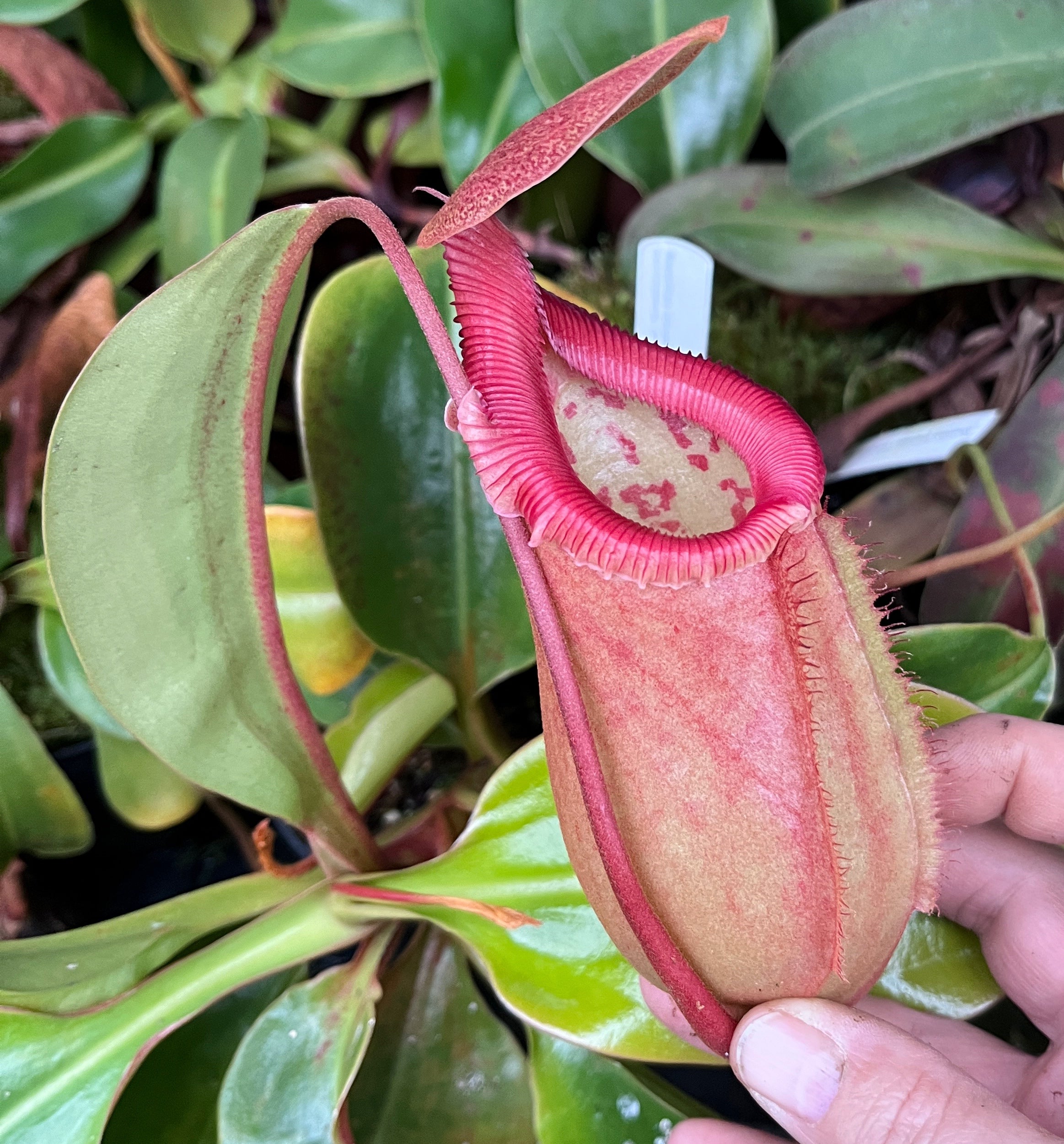 Diese Kannenpflanze wächst zu einer majestätischen Kletterpflanze heran, die selbst in großen Sammlungen heraussticht. Ihre bauchigen Kannen, die bis ins Detail kunstvoll gezeichnet sind, machen sie zu einem wahren Juwel für anspruchsvolle Sammler. Der seltene Zugang zu einer extragroßen Pflanze dieser Hybride unterstreicht ihren Status als unvergleichliches Highlight.