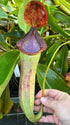 Nepenthes spathulata x lowii wird Ihre eindrucksvollen Kannen in Ihrer Sammlung hervorbringen. Dazu wurde ein Klon der Nepenthes spathulata besonders sorgfältig ausgewählt. Dieser trägt als weiblicher Kreuzungsanteil seine grünen Kannen und das breite, violette Peristom zu dieser Hybride bei. Eine samengezogene Trusmadi-Form der Nepenthes lowii stellt den männlichen Kreuzungsanteil.