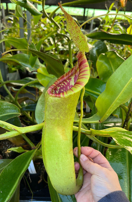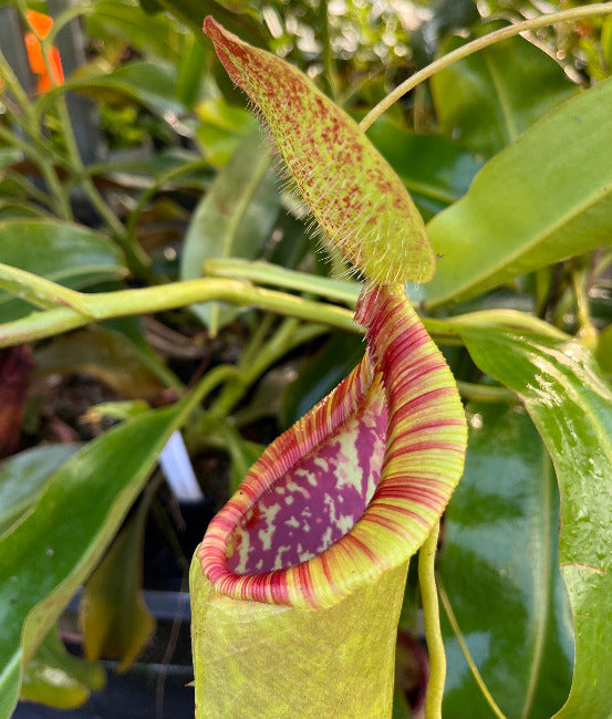 Ausgewachsene Kannen konnten hier noch nicht beobachtet werden. Doch die unteren Kannen bilden sich bereits sehr farbig aus. Mit Spannung werden die ersten oberen Kannen erwartet. Eine Beschreibung niedriger als "faszinierend" ist bei dieser Kreuzung sehr unwahrscheinlich.