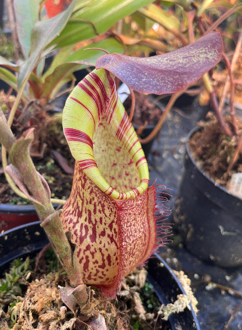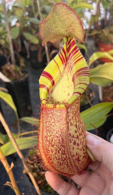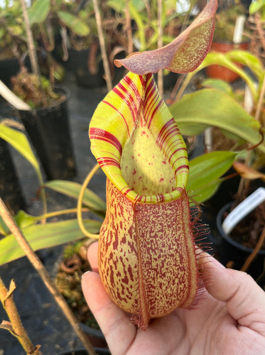 Als groß gewachsene Showpiece-Pflanze eignet sich diese Nepenthes ideal für Sammler, die eine etablierte, präsentationsreife Pflanze suchen und nicht erst Jahre auf diese Wirkung warten möchten. Mit zunehmender Reife intensivieren sich Form und Ausfärbung weiter und unterstreichen den exklusiven Charakter dieser Kreuzung.
