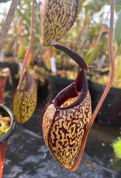 Die Kannen tragen deutlich die Handschrift der Nepenthes aristolochioides. Besonders auffällig ist die intensive, dunkle Mosaikmusterung, die sich kontrastreich über die gesamte Kanne zieht und ihr eine fast dreidimensionale Tiefe verleiht. In Kombination mit der Größe und Eleganz der ausgewählten Riesenform von Nepenthes spectabilis entsteht ein außergewöhnliches Gesamtbild, das in dieser Ausprägung nur selten zu finden ist.